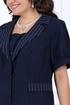 Жакет полуприлегающего силуэта, с центральной бортовой застежкой на 4 петли и 4 пуговицы, с воротником пиджачного типа с отрезными лацканами. Длина жакета по среднему шву спинки 61 см от шва втачивания воротника в горловину. Перед с рельефными швами, проходящими через центр груди, идущими от пройм до низа, с фигурной центральной деталью из шва притачивания клапанов. В нижних частях переда обработаны прорезные карманы в рамку с клапаном. Воротник, лацканы и клапаны карманов выполнены из ткани «полоска». Спинка со средним швом, с рельефами, идущими от пройм до низа. Рукав втачной, одношовный, с притачной по низу манжетой. Длина рукава с учетом манжеты 26 см. Жакет с плечевыми накладками.