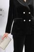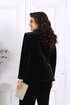 Жакет классический на подкладке, выполнен из велюра. Модель полуприлегающего силуэта с отложным воротником и лацканами «ласточкино крыло». Спереди обработаны смещенные к боковым рельефные швы, направленные от пройм до низа, и вытачки, идущие от прорезных карманов с клапаном до центра груди. Перед с двубортной внешней застежкой на 2 металлические пуговицы и внутренней на 2 потайные. Спинка со средним и рельефными швами. Рукав длинный, втачной, двухшовный. Воротник, лацканы и «рамка» кармана выполнены из сатина в цвет основной ткани. Длина жакета-67 см; длина рукава-61 см.