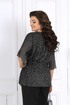 Блузка женская, приталенного силуэта, выполнена из сетки-гофре с нитью «люрекс». Модель на трикотажной подкладке, без застежки и плечевых накладок. Перед дополнен задрапированным поясом с перекрутом, концы которого входят в боковые швы. Для лучшего прилегания по линии талии спинки предусмотрена кулиса с протянутой внутрь эластичной лентой. Горловина округлая, окантована узкой косой бейкой из основного материала. Рукав короткий, расширенный, с фигурным низом, переходящим в разрез, края которого по окату скреплены на запах. Длина блузки – 70 см; длина рукава (на продолжении плечевого шва) – 32 см.
