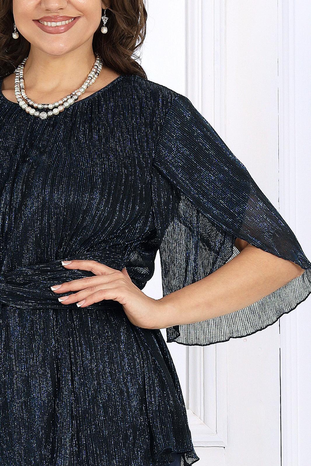 Блузка выполнена из изысканной сетки-гофре с люрексом, которая мягко переливается при каждом движении, создавая благородное сияние. Внутренняя трикотажная подкладка обеспечивает комфорт и делает посадку идеальной даже для полных женщин. Фигурный крой и драпированный пояс с перекрутом формируют женственный силуэт — акцентируют талию, визуально вытягивая фигуру и делая её стройнее. Рукава особого фасона с разрезом добавляют легкости и движения образу, придавая наряду современное звучание и ощущение воздушности.