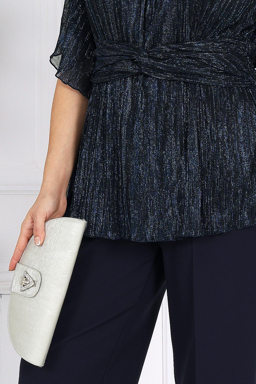 - Тип ткани: блузка - полиэстер 50%, люрекс 50%; подкладка блузки – полиэстер 100%; брюки – полиэстер 97%, спандекс 3%