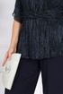 Блузка женская, приталенного силуэта, выполнена из сетки-гофре с нитью «люрекс». Модель на трикотажной подкладке, без застежки и плечевых накладок. Перед дополнен задрапированным поясом с перекрутом, концы которого входят в боковые швы. Для лучшего прилегания по линии талии спинки предусмотрена кулиса с протянутой внутрь эластичной лентой. Горловина округлая, окантована узкой косой бейкой из основного материала. Рукав короткий, расширенный, с фигурным низом, переходящим в разрез, края которого по окату скреплены на запах. Длина блузки – 70 см; длина рукава (на продолжении плечевого шва) – 32 см.