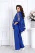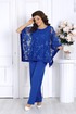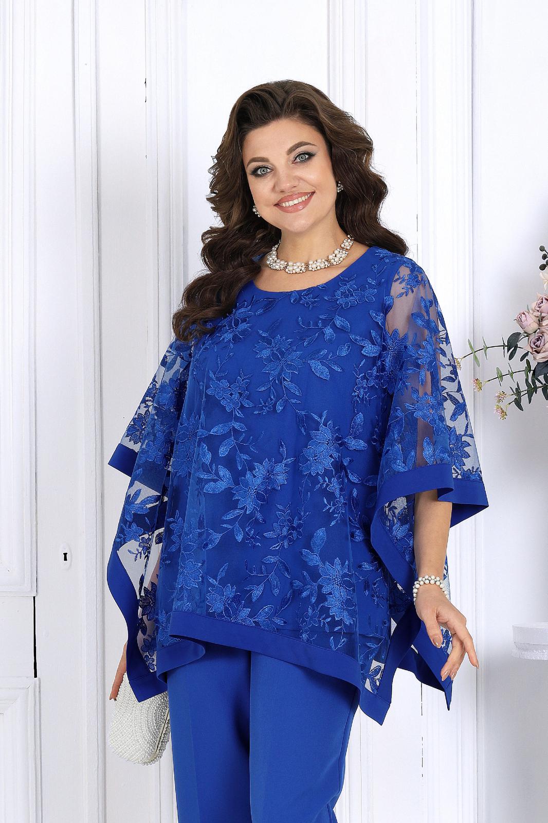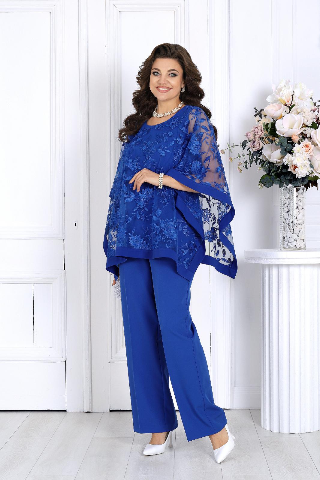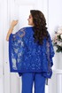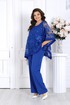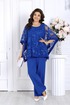 Свободный крой и продуманная посадка делают костюм комфортным для женщин с формами — он не сковывает движения и красиво драпируется, визуально вытягивая силуэт. Верх выполнен в виде эффектной блузки из гипюра, которая мягко скрывает зону рук и талии, а классические брюки со стрелками придают образу стройность и изящество.