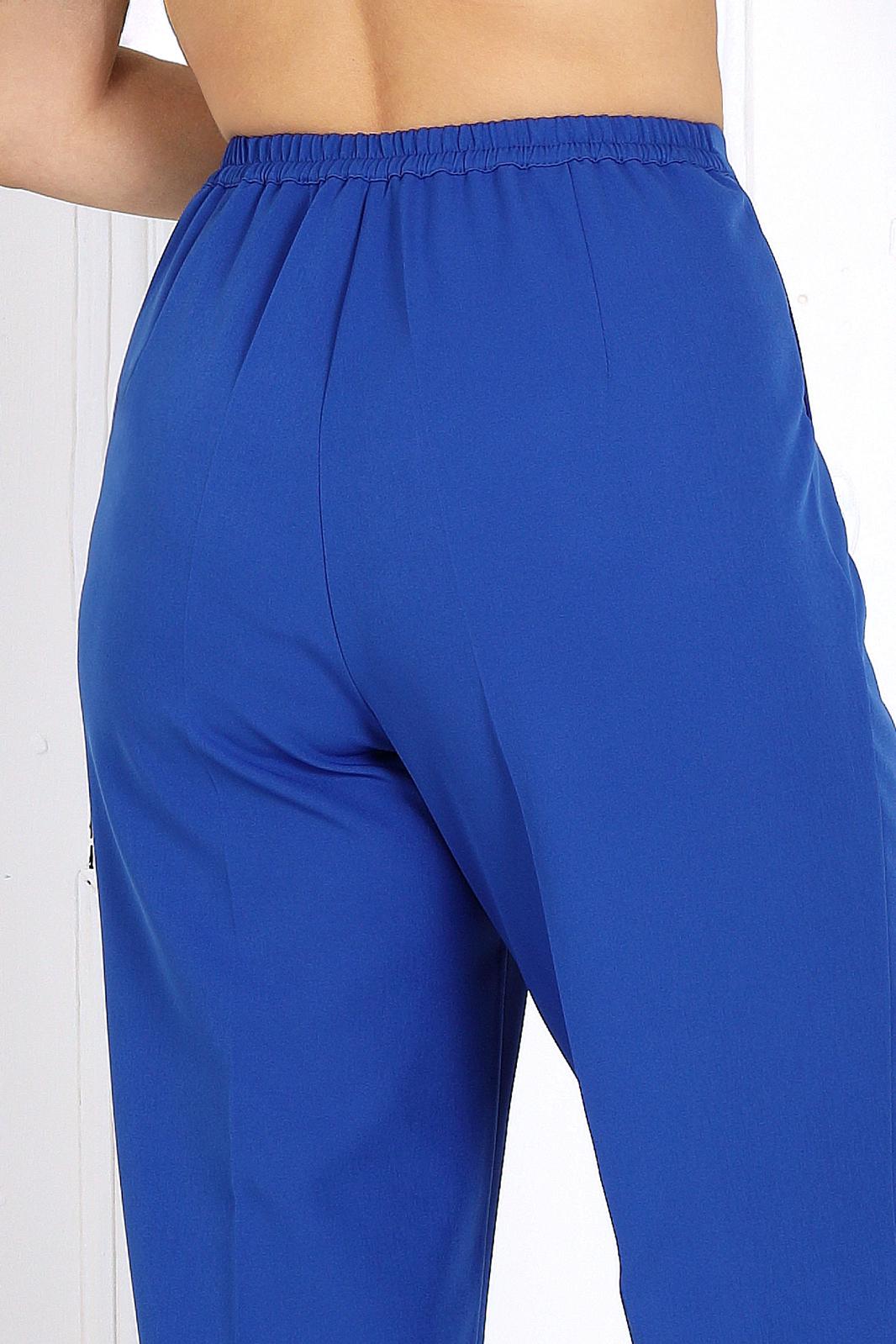 Брюки классические, длинные, с посадкой на талии, выполнены из костюмно- плательной ткани. Модель со стрелками. Передние и задние половинки брюк с талиевыми вытачками, направленными от пояса вниз. Спереди обработаны наклонные боковые карманы и центральная застёжка на тесьму-«молнию». Притачной пояс застегивается на 1 петлю и 1 пуговицу; для лучшего прилегания по линии талии в притачном поясе предусмотрена эластичная лента, вставленная по спинке. Длина брюк по боковому (с поясом) – 107 см.