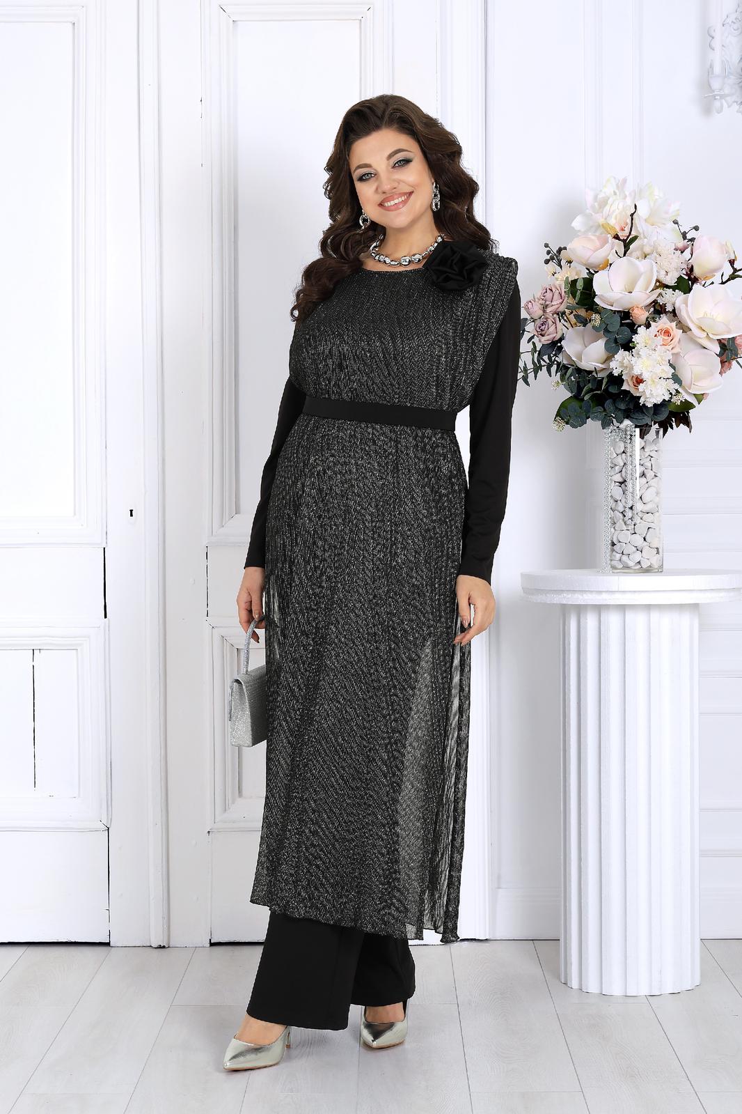 Блестящая туника с люрексом струится по силуэту, создавая эффект легкости и изысканности. В комплект входит пояс, акцентирующий талию, и декоративный цветок, добавляющий женственности и шарма.