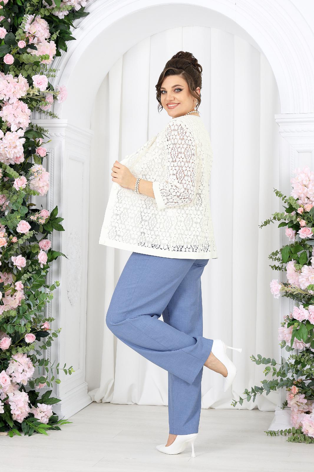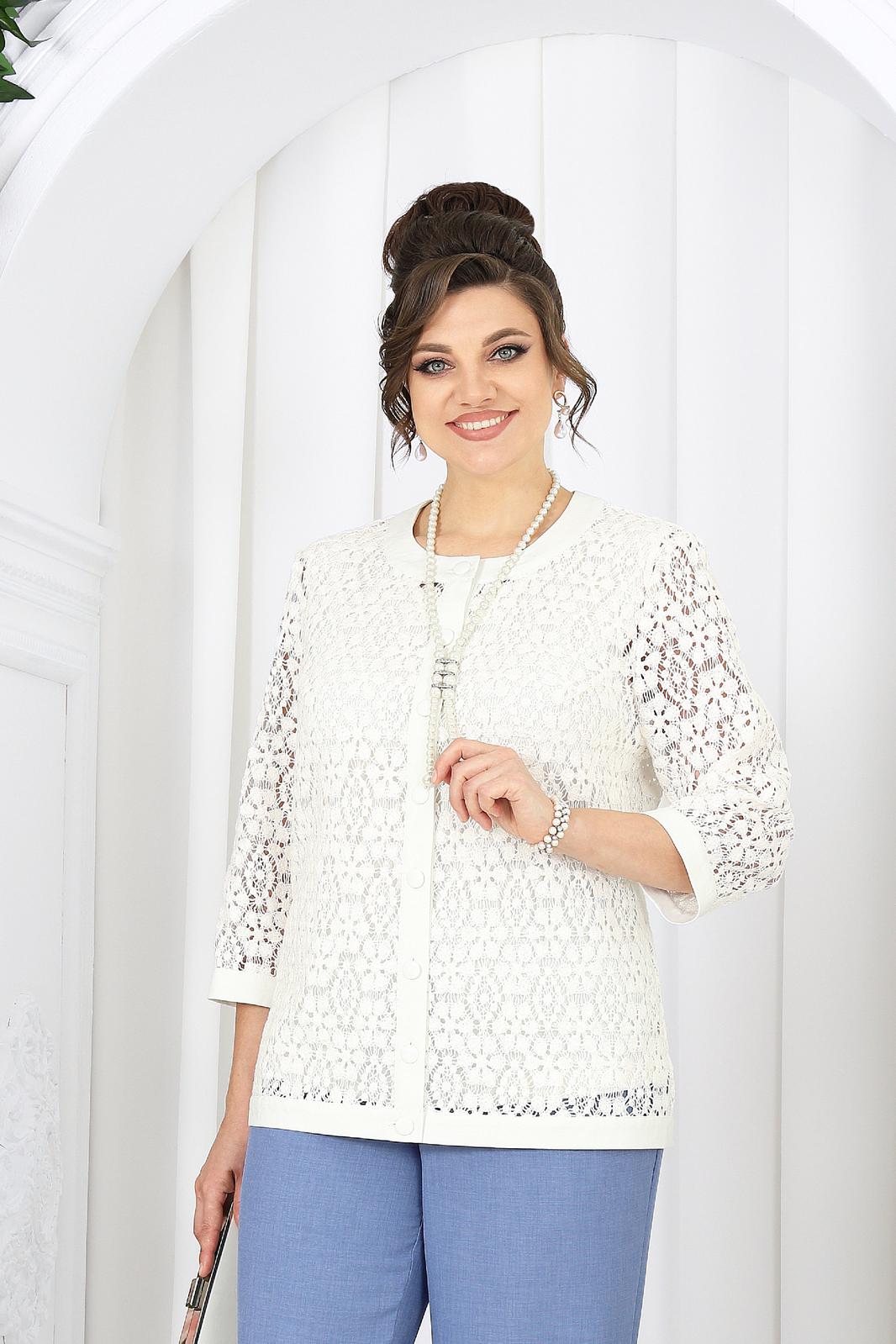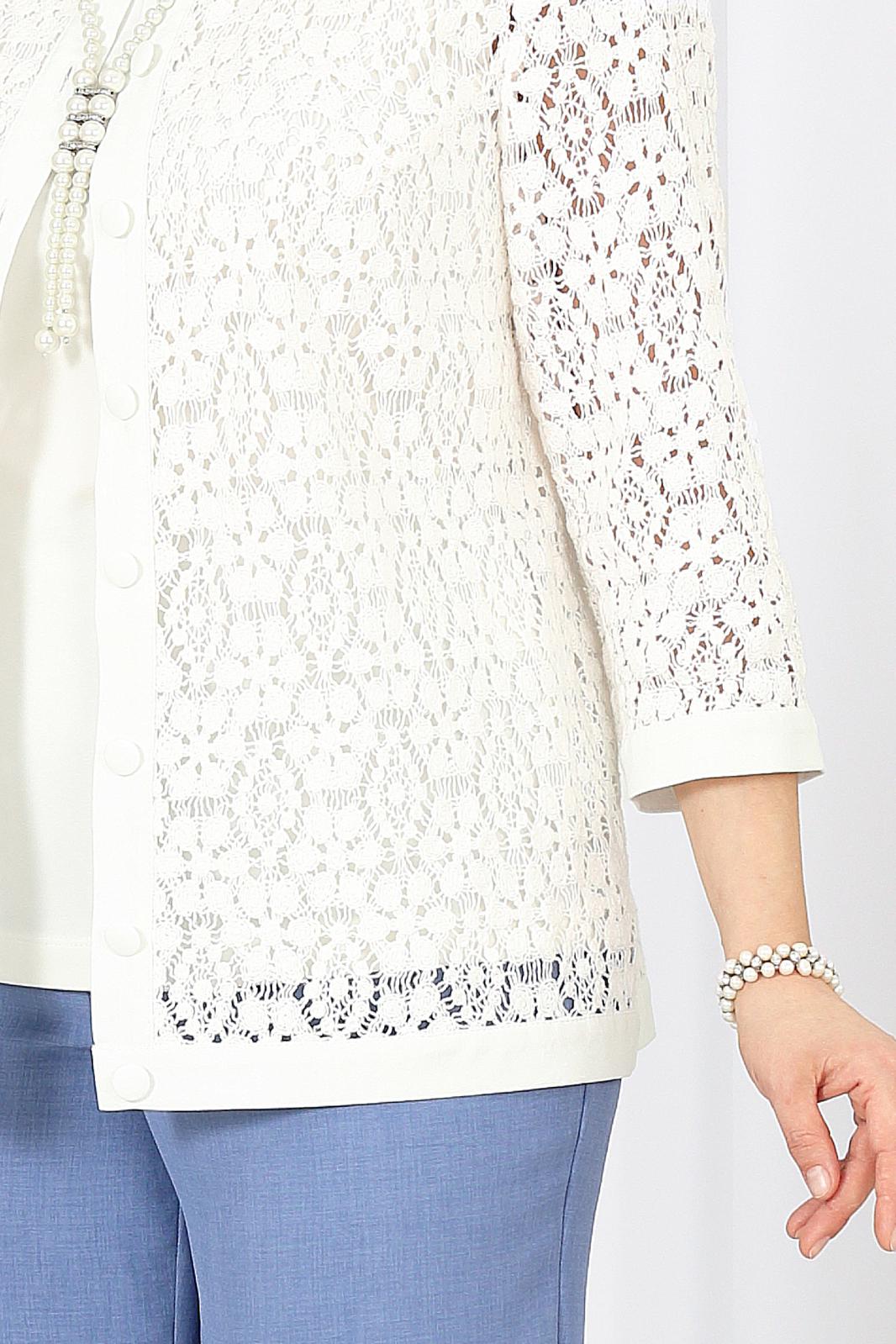 Жакет полуприлегающего силуэта, выполнен из кружева х/б. Модель без подкладки и без плечевых накладок. Перед с нагрудными вытачками, направленными от пройм вниз, и отрезной планкой по подборту и горловине. Жакет с центральной внешней застежкой на 8 петель и пуговиц (обтянутых основной тканью). Рукав 7/8, втачной с притачной замкнутой манжетой по низу. Низ жакета и горловина обработаны по низу притачной планкой из основной ткани. Длина жакета - 64 см (50-58 р-р); длина рукава – 45 см (50-58).