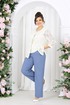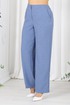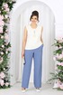 Брюки классические, с посадкой на талии, выполнены из ткани «лен-вишер». Модель без стрелок, с центральной застёжкой на тесьму-«молнию», на притачном поясе, застегивающемся на петлю и пуговицу. Задние половинки брюк с талиевыми вытачками, направленными от пояса вниз. По передним половинкам брюк застрочены складки-«защипы» по центру. Спереди обработаны боковые наклонные карманы. Для лучшего прилегания брюк в области талии в поясе по задним половинкам вставлена эластичная лента. Длина брюк по боковому (с поясом) – 107 см (50-58).