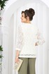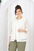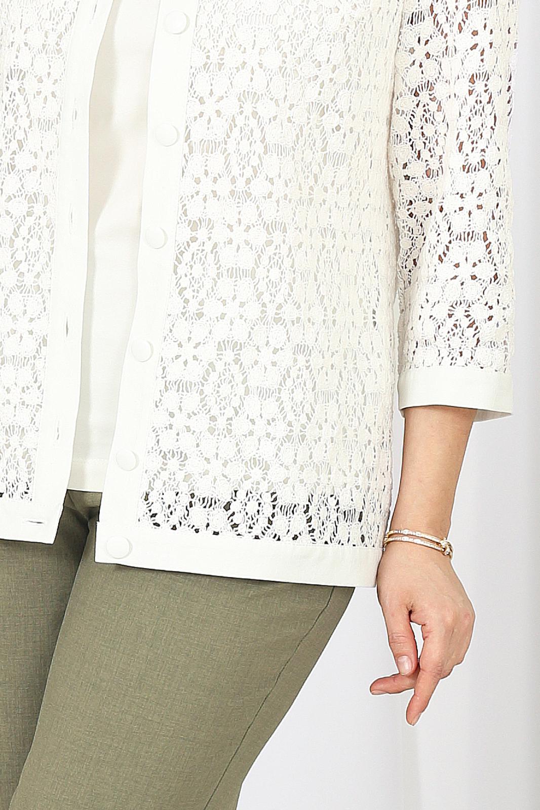 Жакет полуприлегающего силуэта, выполнен из кружева х/б. Модель без подкладки и без плечевых накладок. Перед с нагрудными вытачками, направленными от пройм вниз, и отрезной планкой по подборту и горловине. Жакет с центральной внешней застежкой на 8 петель и пуговиц (обтянутых основной тканью). Рукав 7/8, втачной с притачной замкнутой манжетой по низу. Низ жакета и горловина обработаны по низу притачной планкой из основной ткани. Длина жакета - 64 см (50-58 р-р); длина рукава – 45 см (50-58).