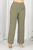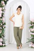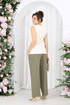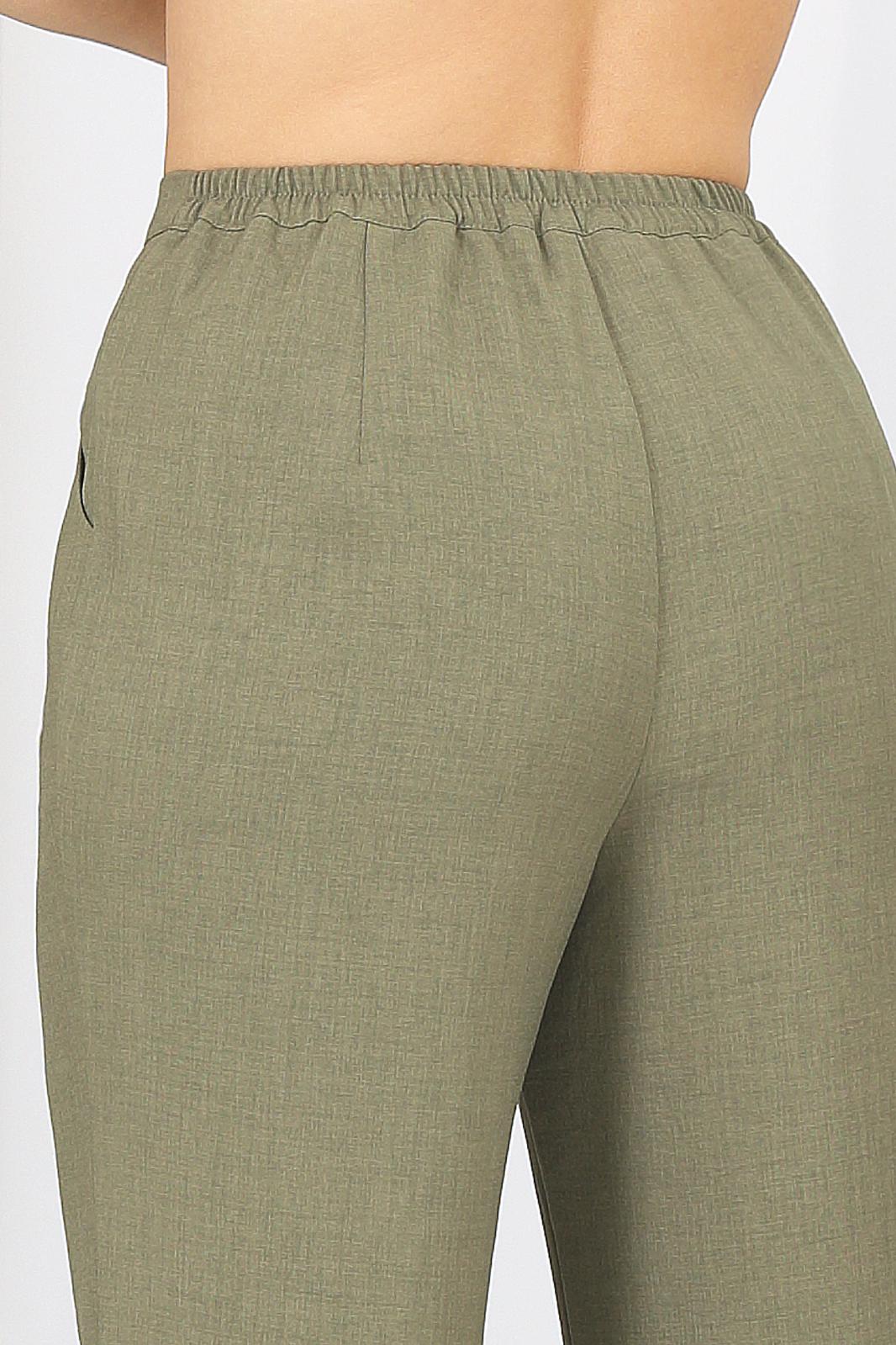 Брюки классические, с посадкой на талии, выполнены из ткани «лен-вишер». Модель без стрелок, с центральной застёжкой на тесьму-«молнию», на притачном поясе, застегивающемся на петлю и пуговицу. Задние половинки брюк с талиевыми вытачками, направленными от пояса вниз. По передним половинкам брюк застрочены складки-«защипы» по центру. Спереди обработаны боковые наклонные карманы. Для лучшего прилегания брюк в области талии в поясе по задним половинкам вставлена эластичная лента. Длина брюк по боковому (с поясом) – 107 см (50-58).