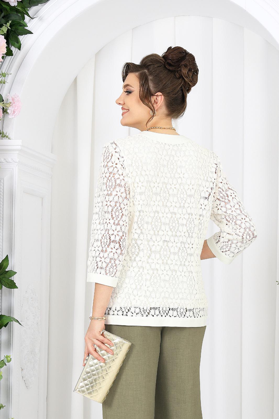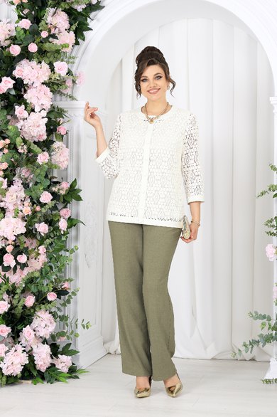 Кружевной жакет добавляет образу изысканности и глубины, словно тонкая работа мастера. Полупрозрачная фактура мягко играет на свету, подчеркивая деликатность и статус. Под ним — лаконичный джемпер из вискозного трикотажа, который дарит комфорт и ощущение уюта в течение всего дня.