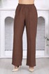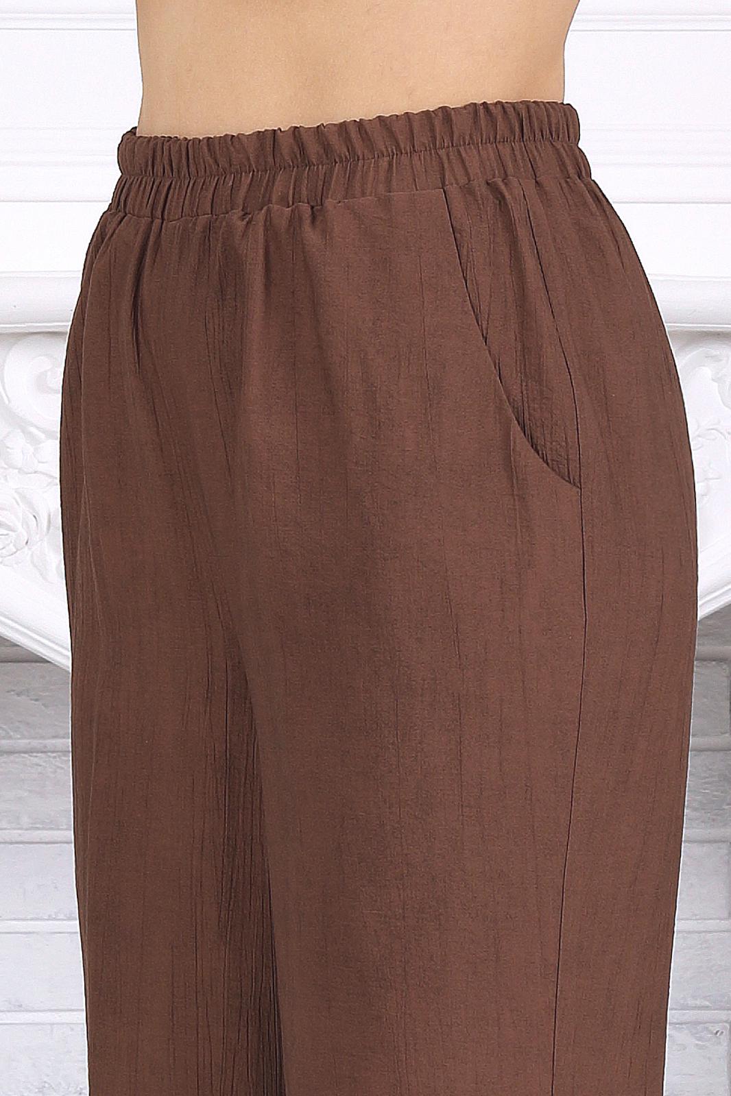Брюки длинные, прямого силуэта, с посадкой на талии, выполнены из вискозного полотна. Модель без стрелок, без застежки, с наклонными боковыми карманами, на притачном поясе с эластичной лентой внутри. Спереди обработаны наклонные боковые карманы. Длина брюк по боковому (с поясом) – 107 см (50-58 р-р).