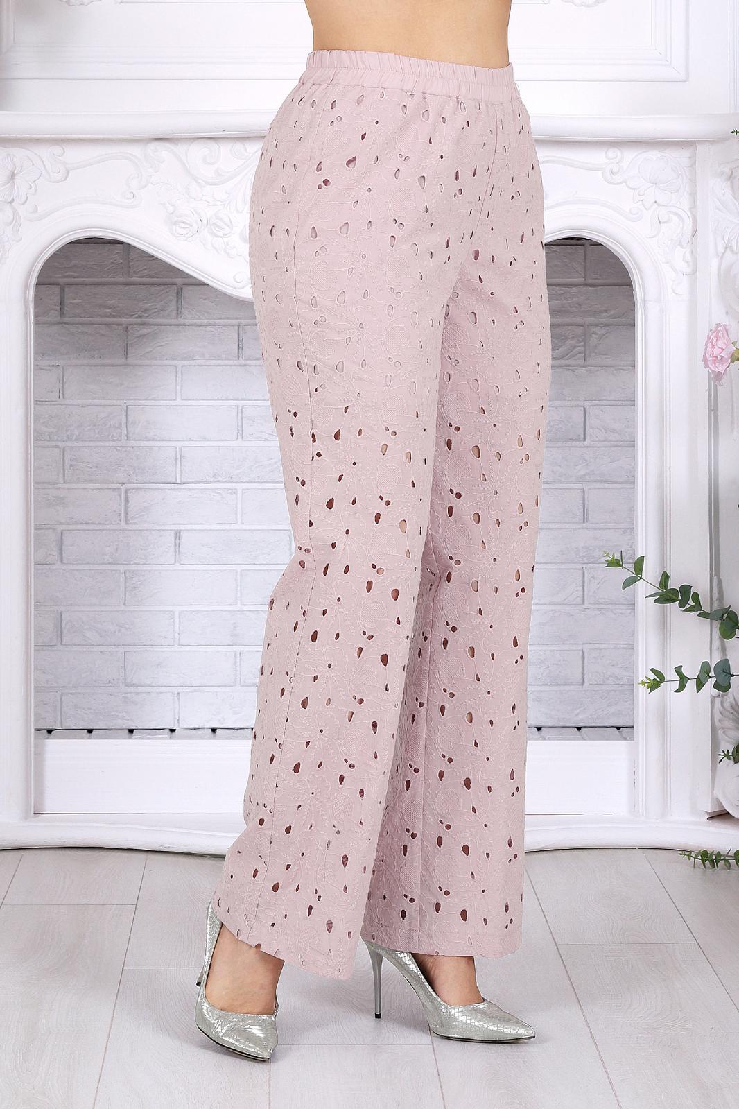 Брюки длинные, прямого силуэта, с посадкой на талии, выполнены из хлопкового ришелье на хлопковой подкладке до линии колен. Модель без стрелок, без застежки, с наклонными боковыми карманами, на притачном поясе с широкой эластичной лентой внутри. Длина брюк по боковому шву (с поясом) – 107 см (50-58 р-р).