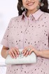 Блузка прямого силуэта, удлинённая по спинке, выполнена из хлопкового ришелье. Модель с втачным коротким рукавом. Рукав оформлен манжетой с подворотом из хлопчатобумажной ткани-компаньона. Перед с центральной застежкой, по притачной планке 8 петель и 8 пуговиц. Горловина оформлена отложным воротником на отрезной стойке. Перед блузки с вытачками по линии груди, направленными от пройм. Длина блузки –71 см (50-58 р-р); длина рукава 25 – см (50-58 р-р).