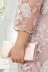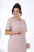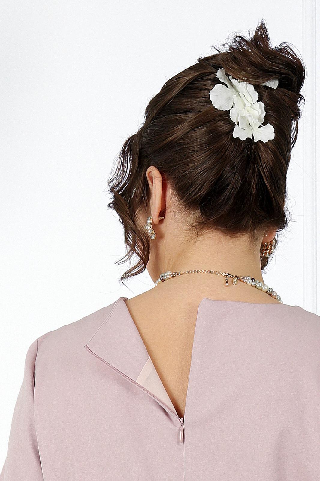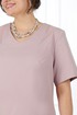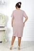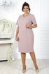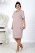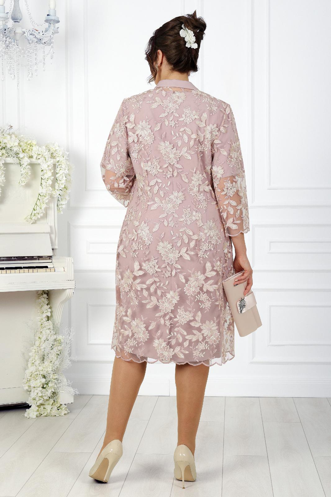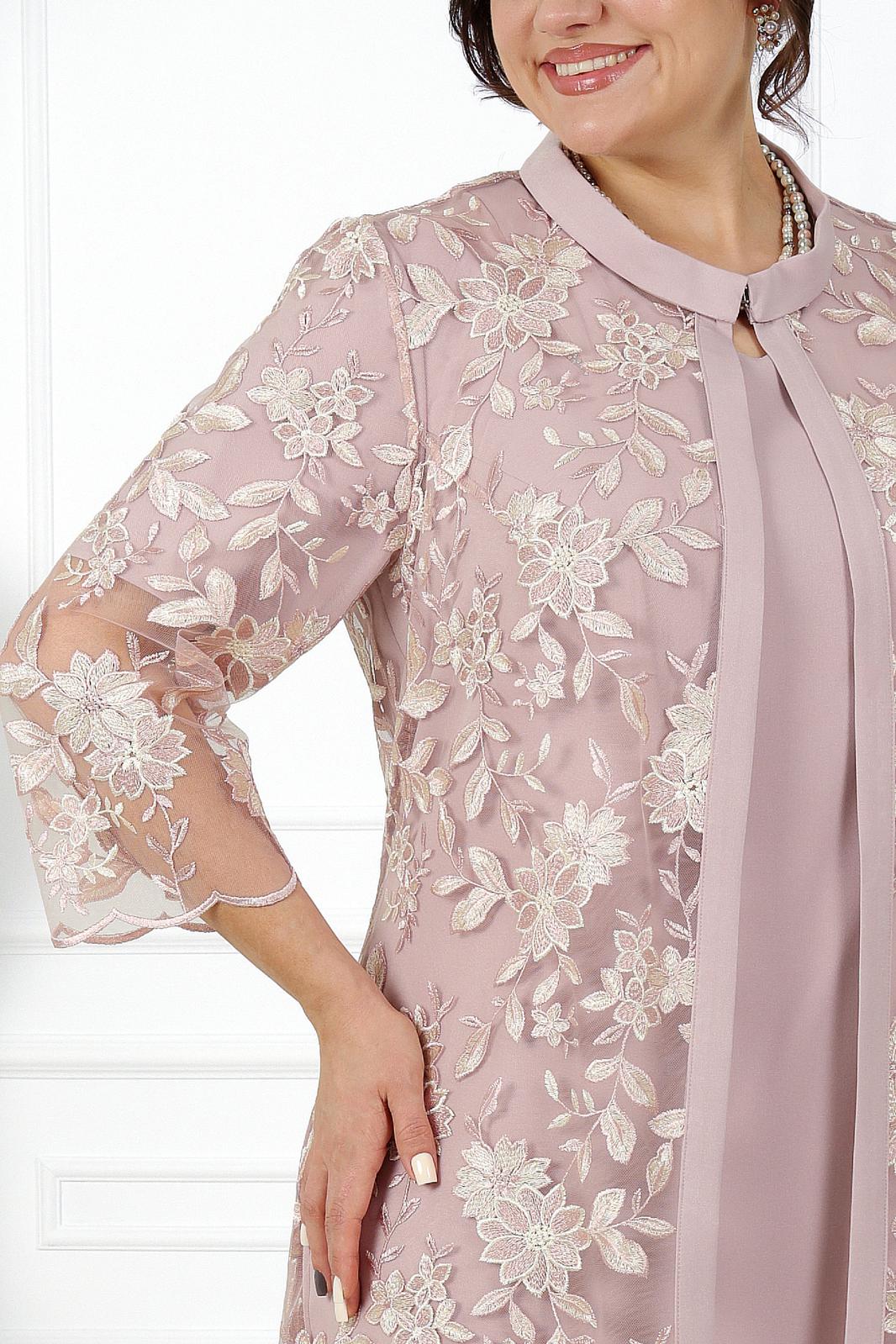 Платье женское полуприлегающего силуэта, длиной по среднему шву спинки 103 см, перед и спинка на трикотажной подкладке. Перед платья с нагрудными вытачками из проймы, с втачными деталями из шифона идущими от плечевых швов вниз, украшенными клеевыми стразами. Спинка с талиевыми вытачками и средним швом, в котором в верхней части расположена застежка на потайную тесьму-молнию, в нижней части- шлица. Горловина спинки округлой формы, по переду V- образной, углубленная. Рукав втачной, одношовный, длиной 27 см.