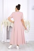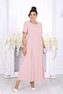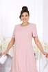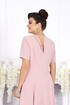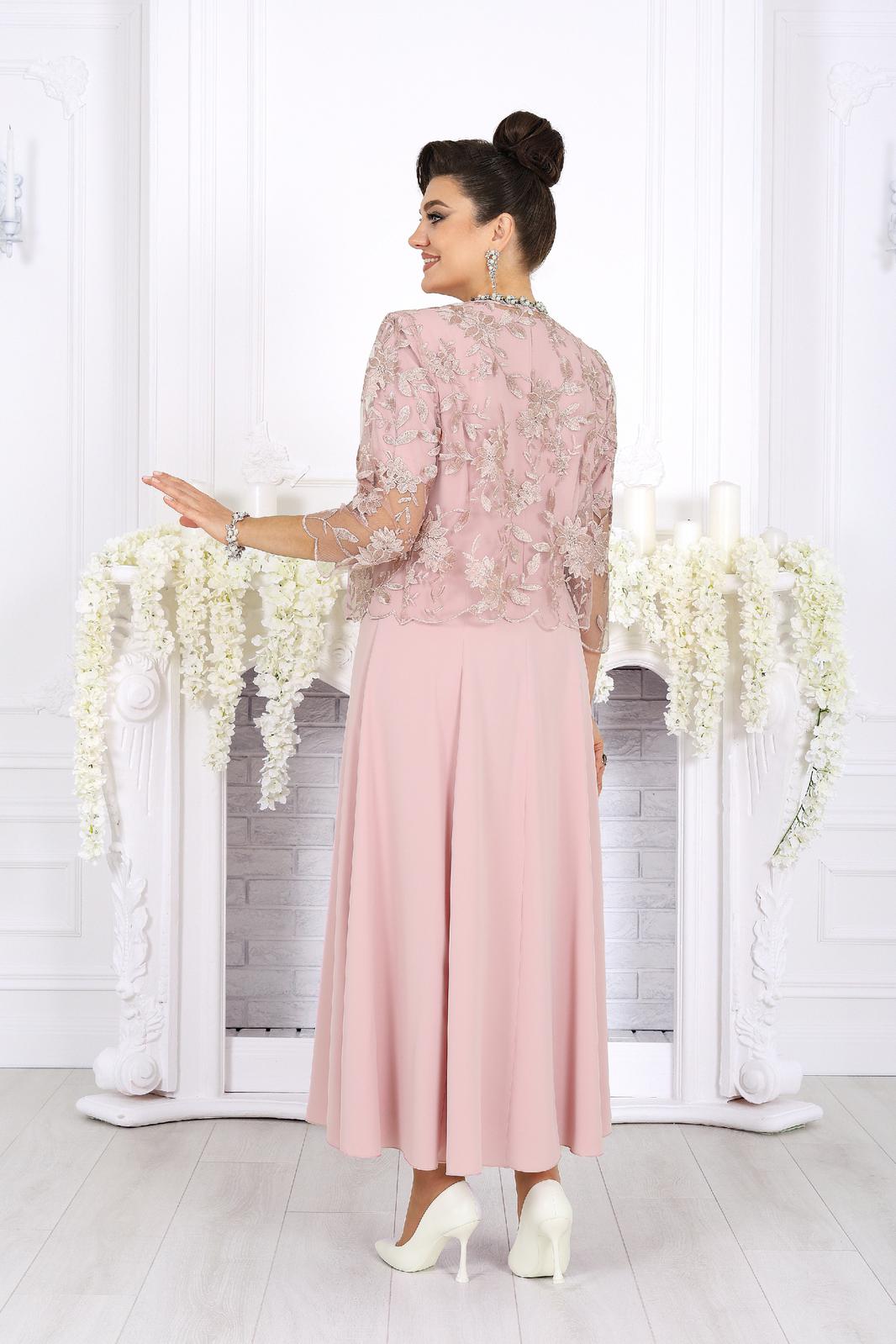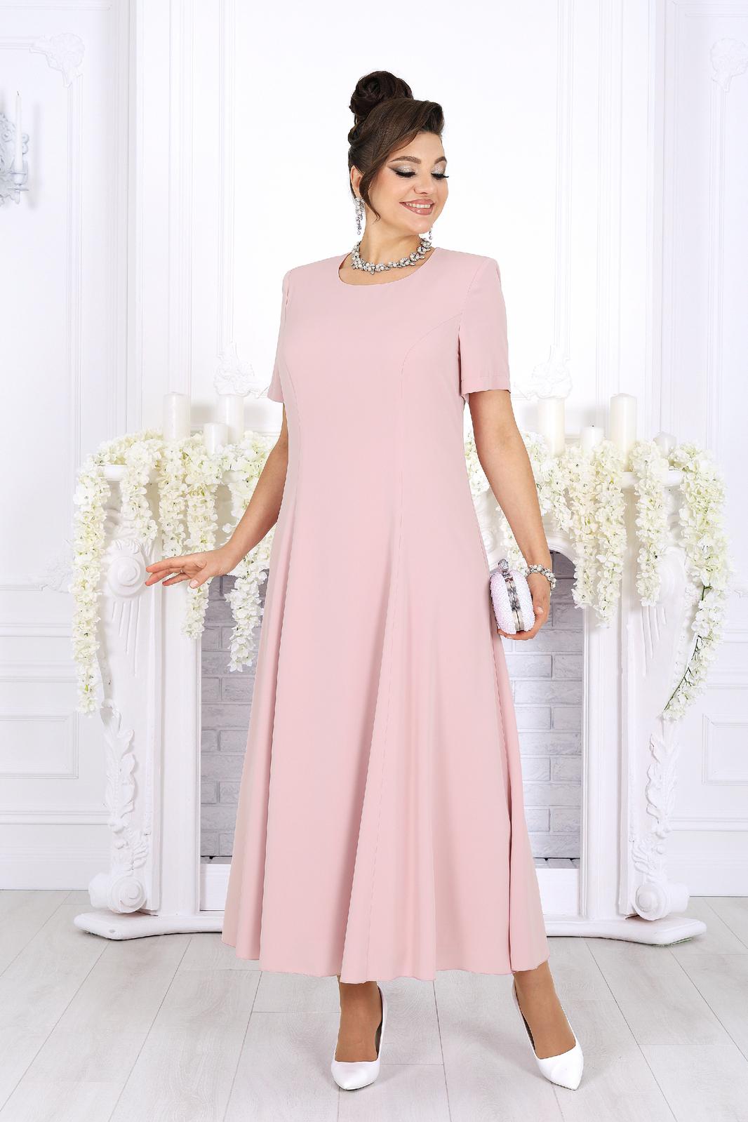 Платье полуприлегающего силуэта, расклешенное к низу. Модель двухслойная, оба слоя выполнены из плательного стрейч-шифона и скреплены по горловине и проймам. Перед с рельефными швами, проходящими через центр груди, идущими от пройм до низа. Спинка с рельефными швами, идущими от пройм до низа; в среднем шве обработана застежка на потайную тесьму-«молнию» (50 см). Горловина округлой формы, углубленная спереди. Рукав втачной, короткий. Платье с плечевыми накладками. Длина платья – 131 см, длина рукава – 25 см.
