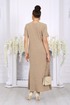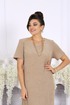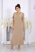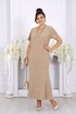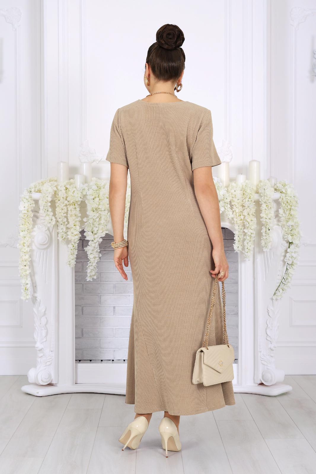 Платье полуприлегающего силуэта, выполнено из фактурного трикотажного полотна с рубчиком. На продолжении боковых швов, в нижней части платья – притачные клинья, придающие силуэту расширение к низу. Модель без подкладки, без застежки и плечевых накладок. Перед с нагрудными вытачками, направленными от пройм, спинка – с талиевыми. Горловина круглой формы, углубленная спереди. Рукав втачной, короткий. Длина платья – 130 см; длина рукава – 22 см.