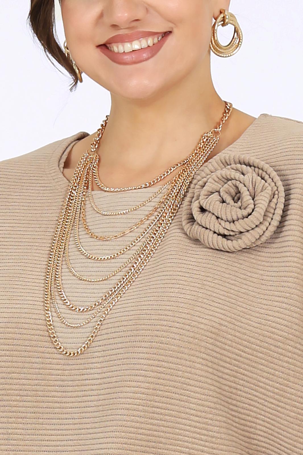 Джемпер свободного силуэта, выполнен из фактурного трикотажного полотна с рубчиком. Модель с разрезами в боковых швах, без подкладки, без застежки и плечевых накладок Горловина круглой формы, углубленная спереди. Рукав длинный, цельнокроеный с деталями переда и спинки; по низу рукава манжета с вырезом для большого пальца. Джемпер дополнен съемным «цветком» из основного полотна. Длина джемпера – 46 см; длина рукава (от горловины) – 77 см.