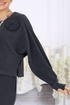 Джемпер свободного силуэта, выполнен из фактурного трикотажного полотна с рубчиком. Модель с разрезами в боковых швах, без подкладки, без застежки и плечевых накладок Горловина круглой формы, углубленная спереди. Рукав длинный, цельнокроеный с деталями переда и спинки; по низу рукава манжета с вырезом для большого пальца. Джемпер дополнен съемным «цветком» из основного полотна. Длина джемпера – 46 см; длина рукава (от горловины) – 77 см.
