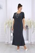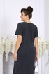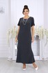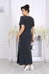 Платье полуприлегающего силуэта, выполнено из фактурного трикотажного полотна с рубчиком. На продолжении боковых швов, в нижней части платья – притачные клинья, придающие силуэту расширение к низу. Модель без подкладки, без застежки и плечевых накладок. Перед с нагрудными вытачками, направленными от пройм, спинка – с талиевыми. Горловина круглой формы, углубленная спереди. Рукав втачной, короткий. Длина платья – 130 см; длина рукава – 22 см.