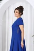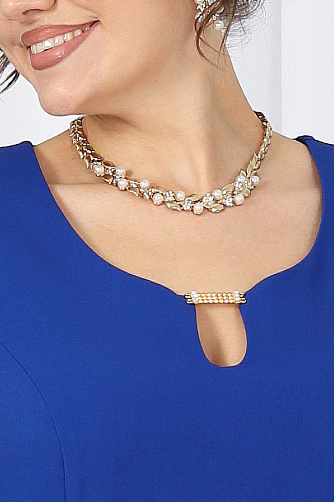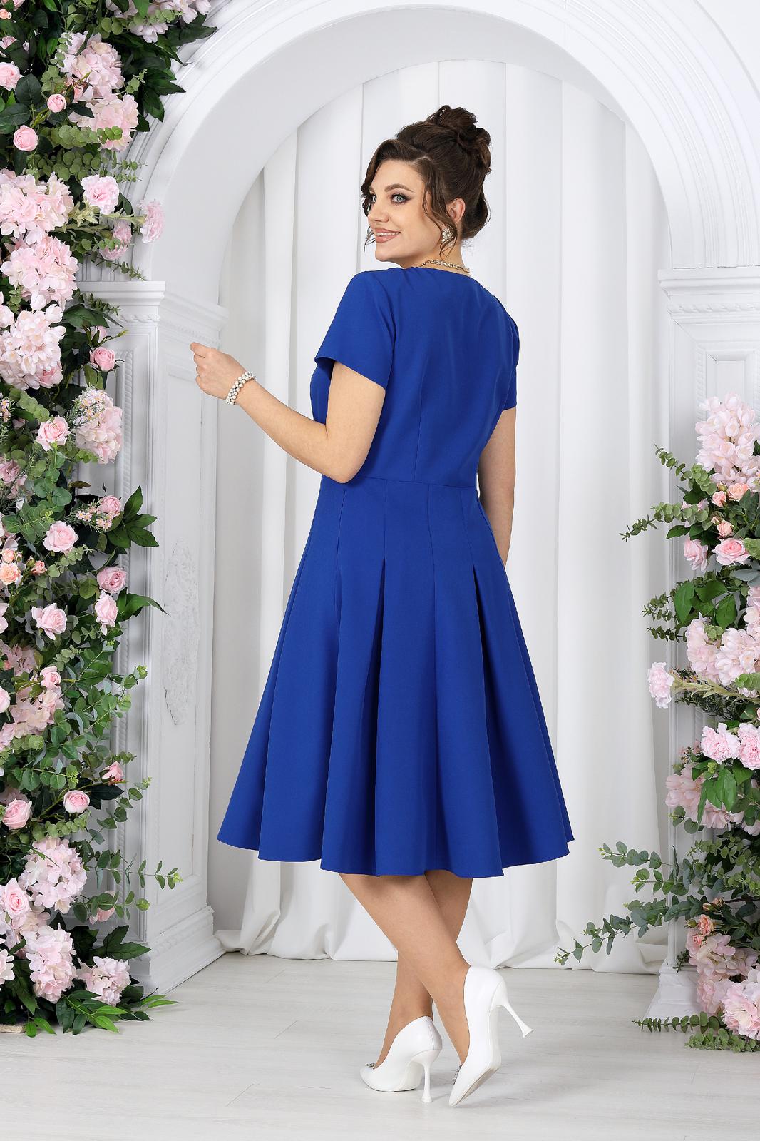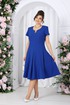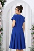 Платье полуприлегающего силуэта, отрезное по линии талии, выполнено из костюмно-плательной ткани. На детали переда рельефы выходят из проймы, проходят через центр груди вниз. Спинка цельнокроеная, с талиевыми вытачками. Юбка расширена к низу, с тремя клиньями спереди и сзади. По середине каждого клина застрочены встречные складки. В левом боковом шве обработана застежка на потайную тесьму молнию. Рукава втачные, одношовные. Горловина углубленная, обтачная, с вырезом в виде “капельки” по середине переда. Углы выреза скреплены украшением. Изделие с плечевыми накладками.