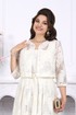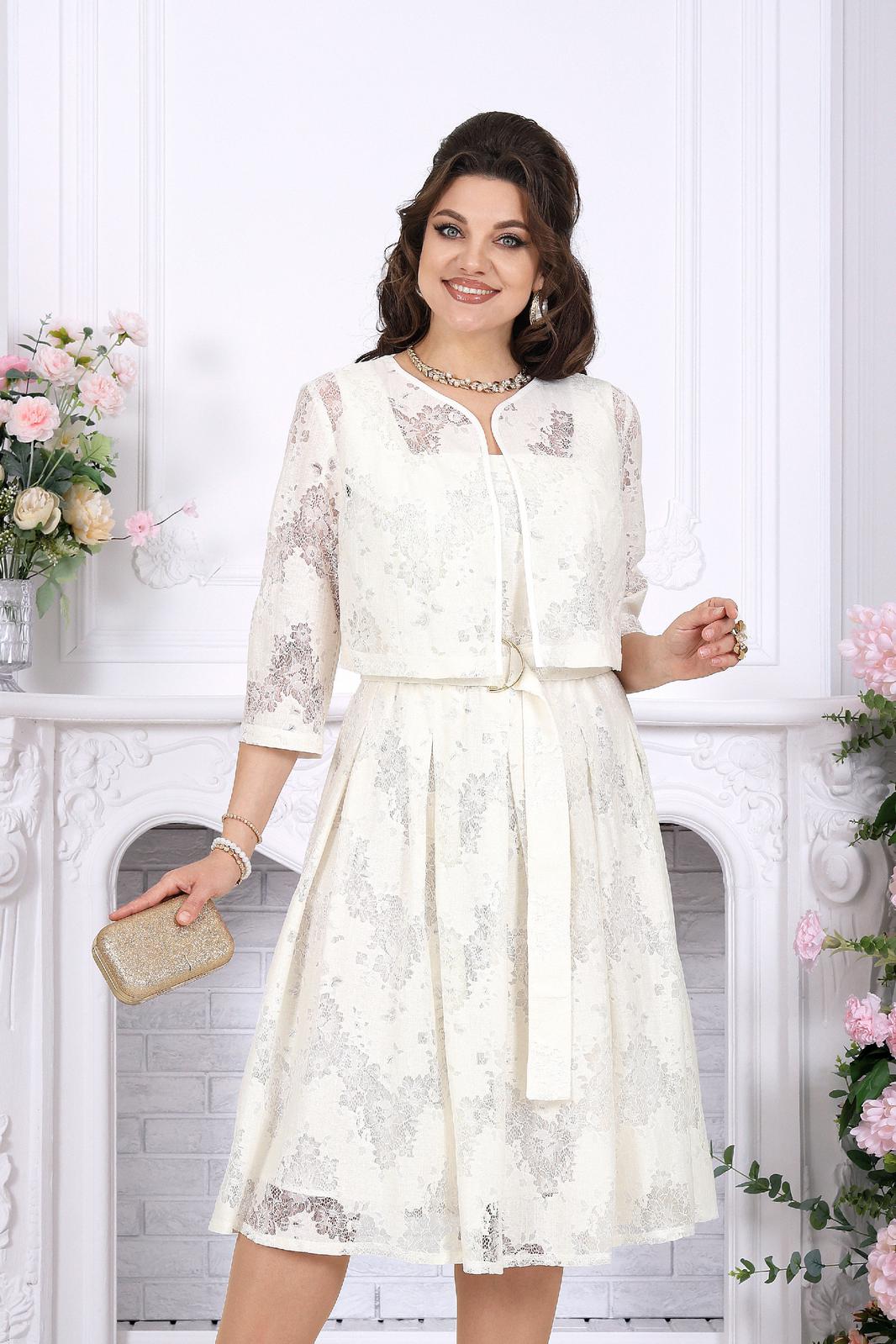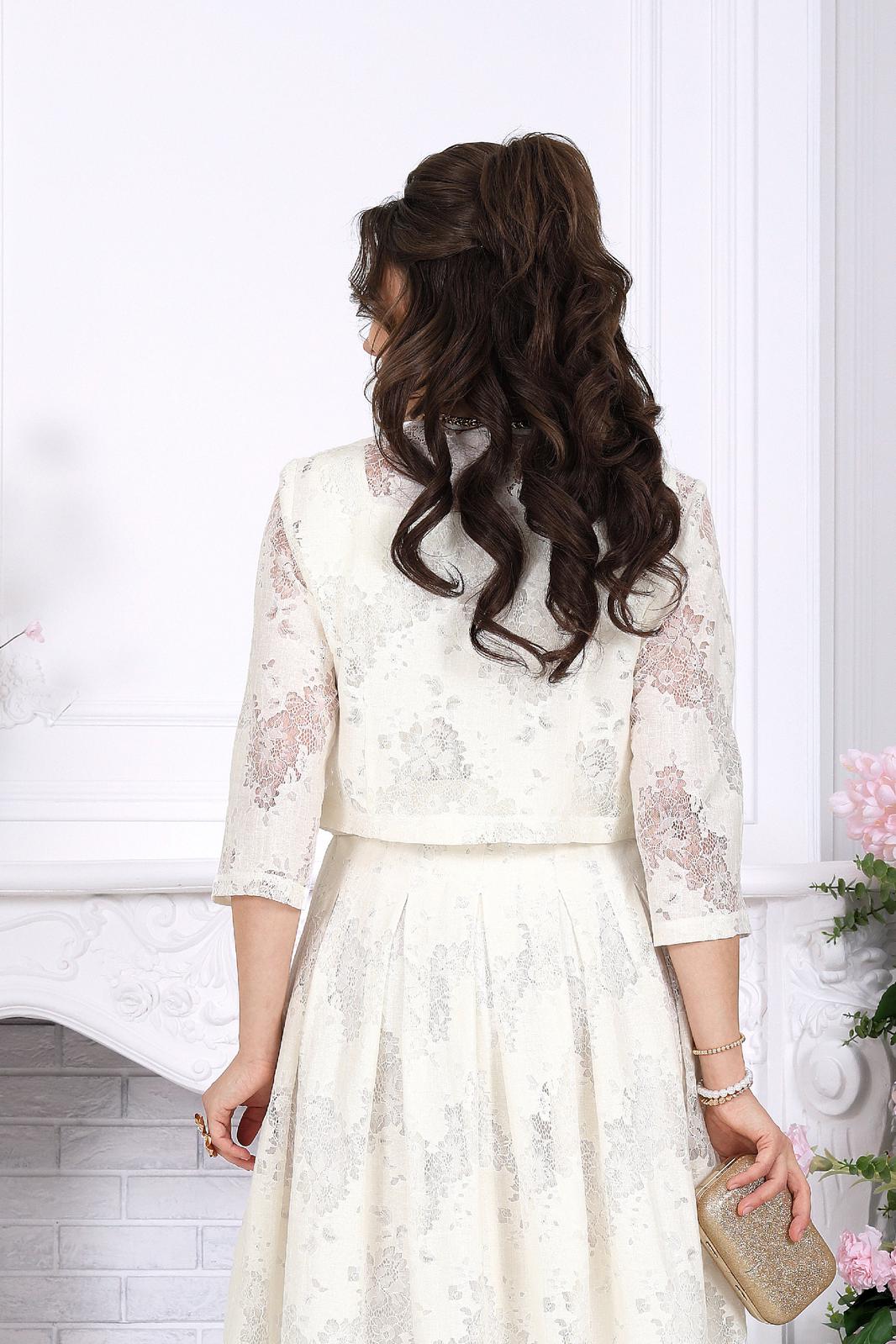 Праздничный костюм двойка с платьем — идеальное сочетание утончённости и комфорта. Сарафан из хлопкового кружева мягко ложится по фигуре, подчёркивая женственность, а встречные складки добавляют образу лёгкости и благородной динамики. Квадратный вырез красиво открывает линию плеч и шеи, создавая элегантный вечерний акцент. Пояс с декоративной пряжкой-полукольцами деликатно выделяет талию, формируя гармоничный силуэт.
