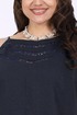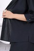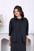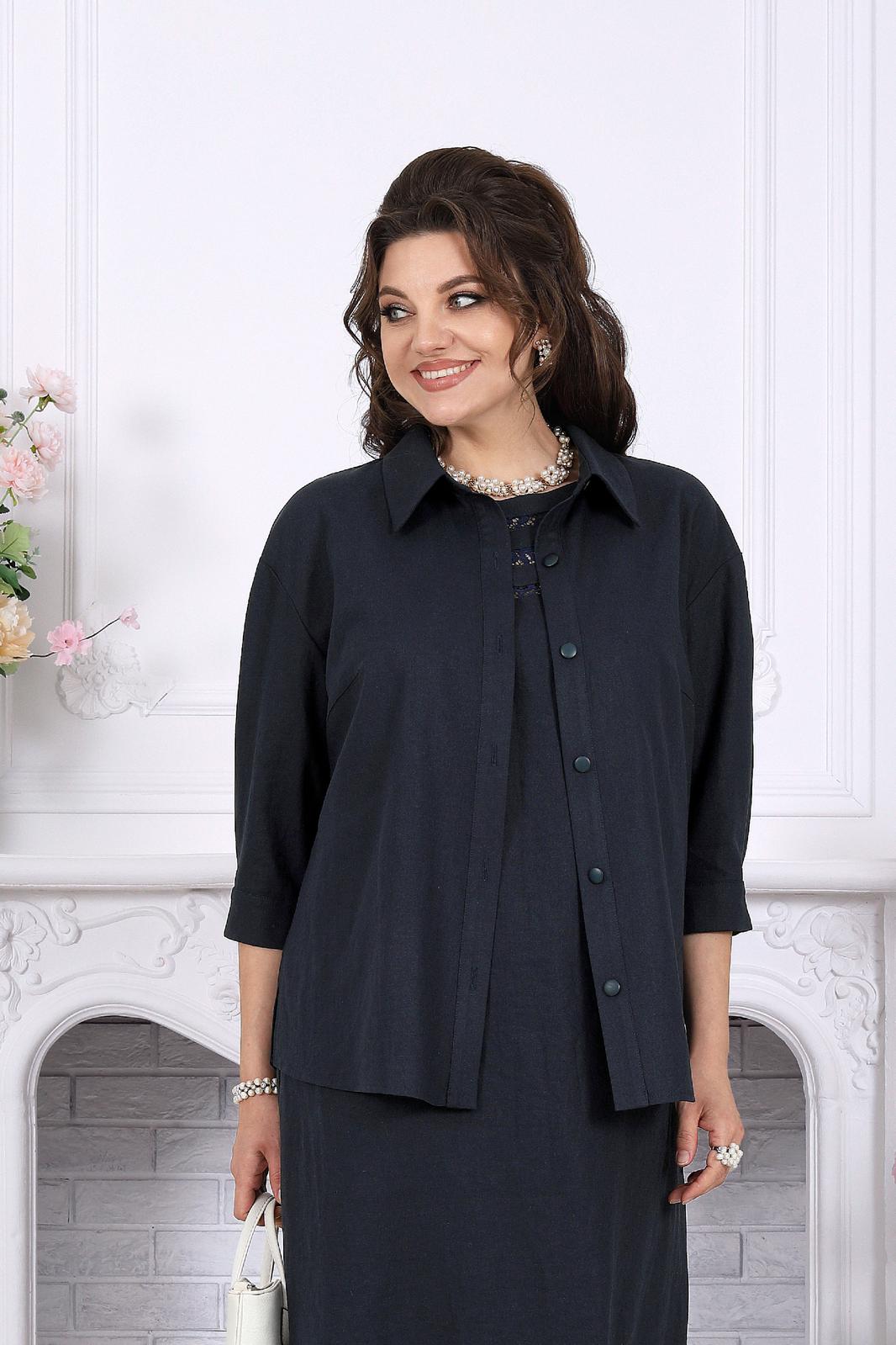 Блузка прямого силуэта со спущенной линией плеча, выполнена из льняной ткани. Перед с нагрудными вытачками, направленными от пройм и с центральной застёжкой на 6 петель и 6 пуговиц по притачной планке. Спинка блузки со средним швом. Горловина оформлена отложным воротником на отрезной стойке. Низ переда и спинки закруглён к боковым швам и переходит в разрезы. Рукав втачной, длиной ¾, низ рукава обработан притачной манжетой, с застёжкой на две петли и две пуговицы. Длина блузки –66 см; длина рукава –55 см.