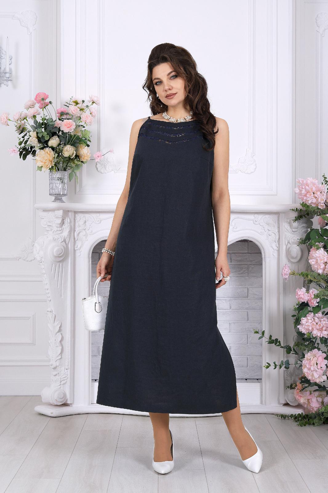 Сарафан А силуэта на бретельках с регулировкой, изготовлен из льняной ткани. Перед с нагрудными вытачками, направленными от пройм, спинка со средним швом. В сарафане по переду горловина V-образная и обработаны декоративные вставки из гипюра. Сарафан на хлопчатобумажной подкладке и с разрезами по боковым швам. Длина сарафана – 112 см.