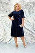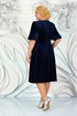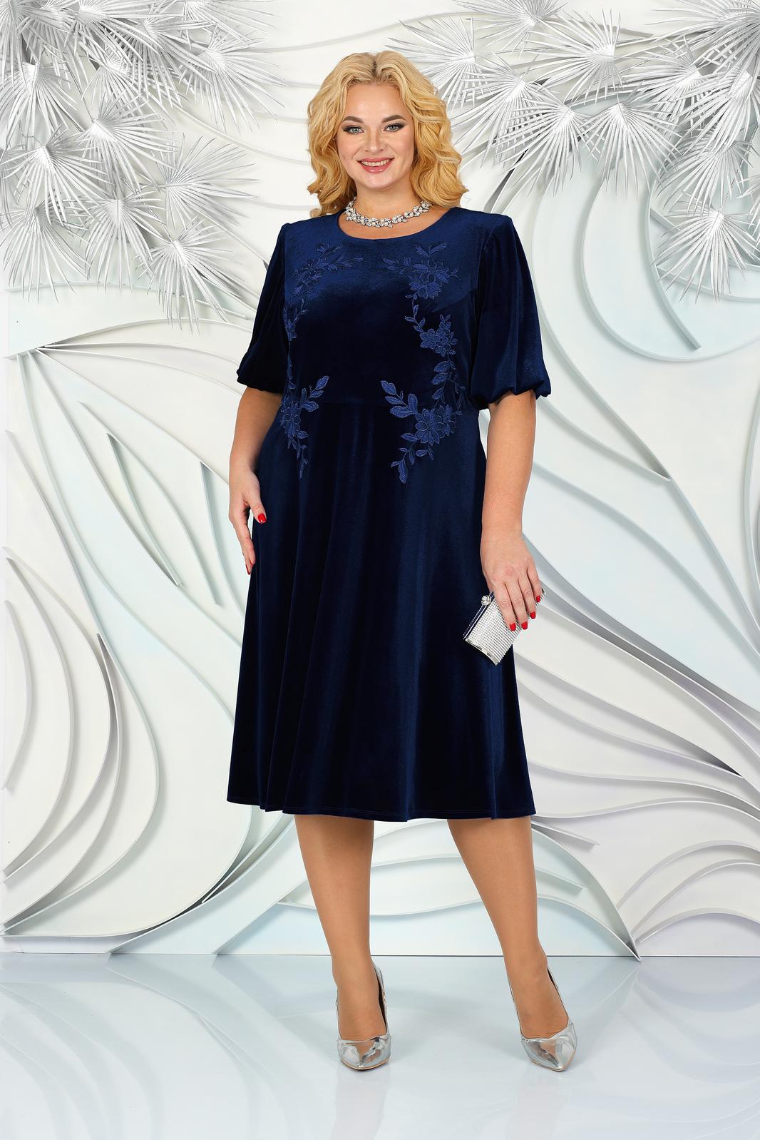Платье женское, полуприлегающего силуэта, расширенное к низу, выполнено из велюра, на трикотажной подкладке, отрезное по линии талии. Длина платья по среднему шву спинки 108 см. Верхняя часть переда с нагрудными вытачками, идущими от пройм. От горловины вниз, через центр груди, нашиты симметричные аппликации, которые спускаются вниз на юбку. Спинка со средним швом, от горловины до низа юбки, в котором обработана потайная застёжка на тесьму - молнию, от горловины вниз. Верхняя часть спинки с талиевыми вытачками. Вырез горловины спинки и переда круглый. Рукава втачные, одношовные, длиной 40 см, собранные по низу на резинку. Платье с плечевыми накладками.