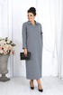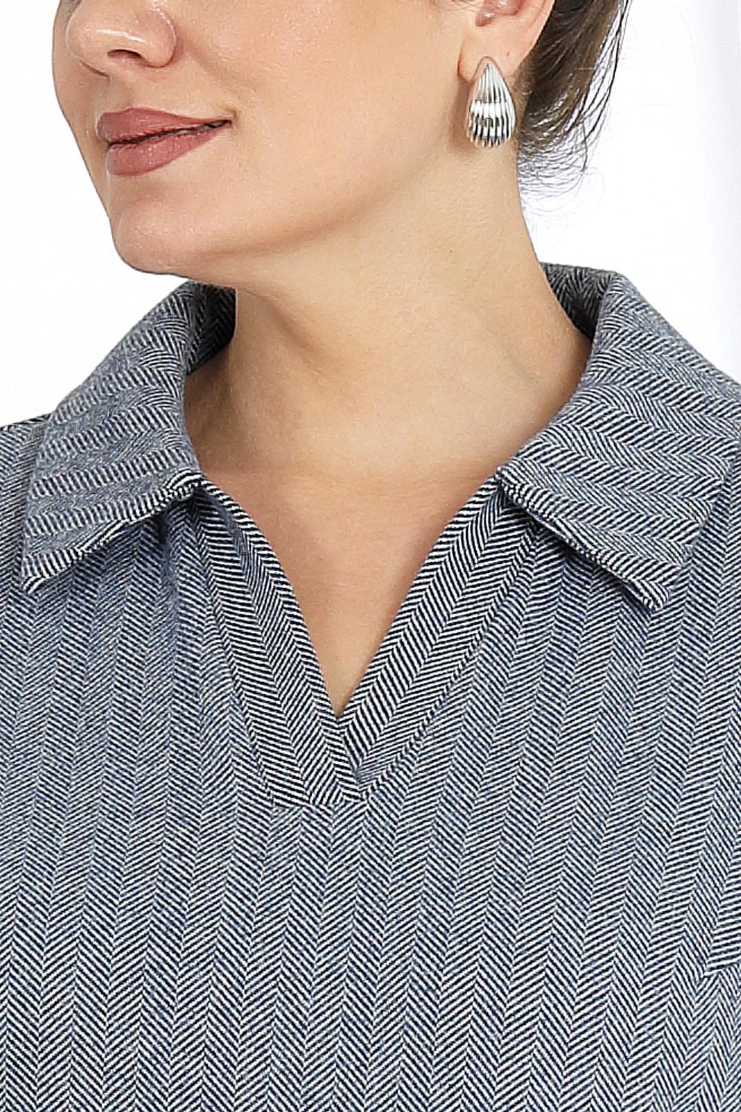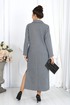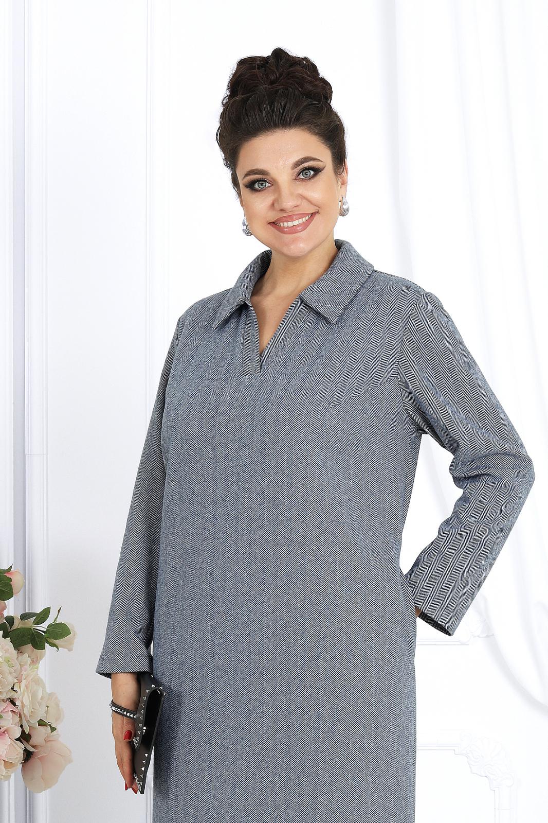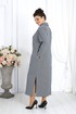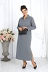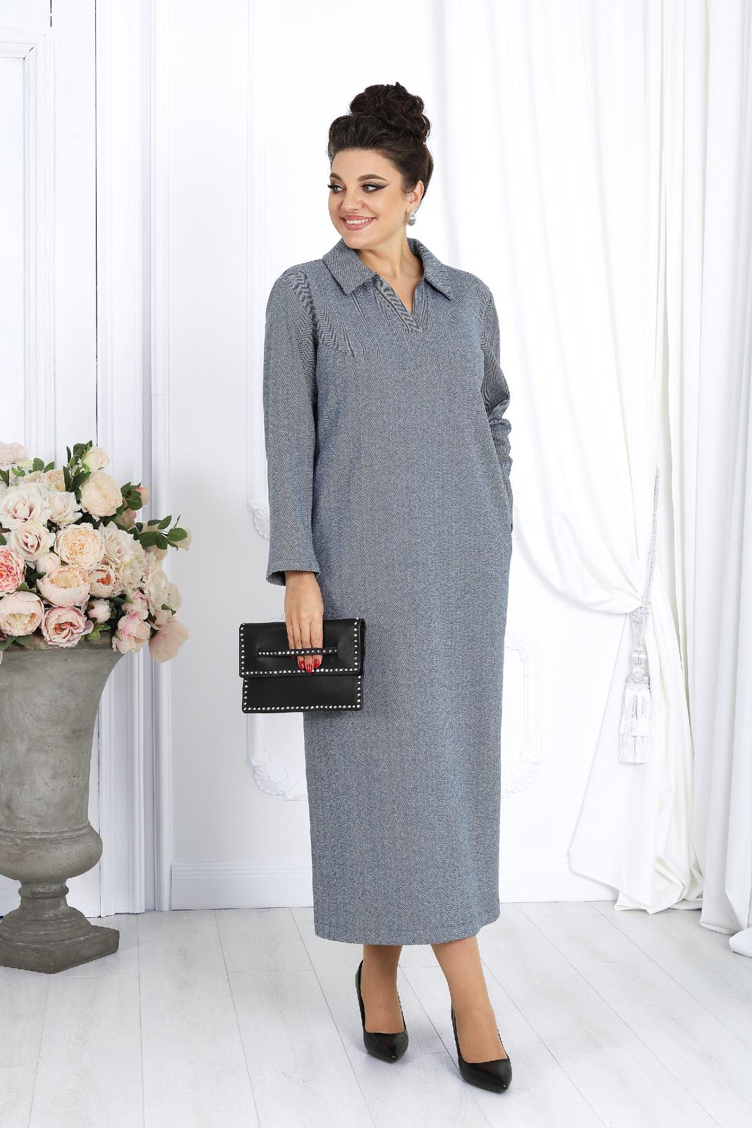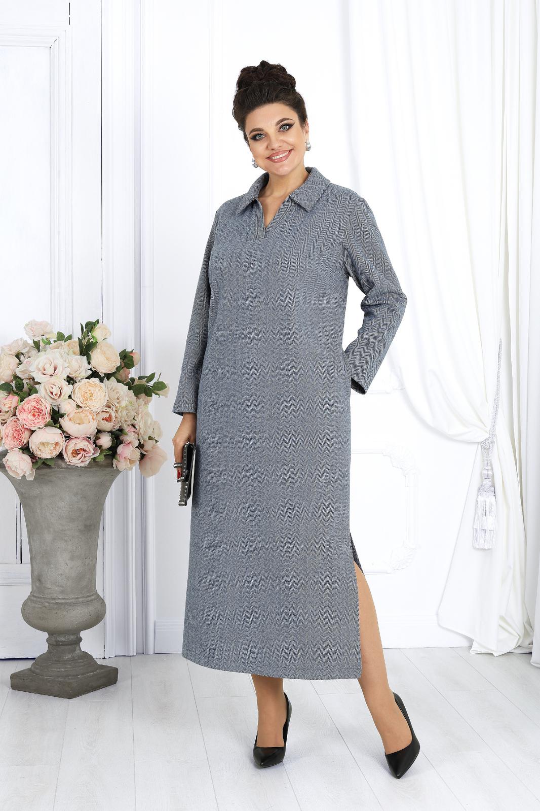 Платье женское, прямого силуэта, расширенное к низу, выполнено из трикотажного полотна. Платье женское прямого силуэта, длиной по среднему шву спинки 124 см, от шва втачивания воротника. Перед платья с нагрудными вытачками из проймы. Спинка со средним швом. В боковых швах обработаны карманы и разрезы. Воротник рубашечного типа, по переду планка «поло». Рукав втачной, одношовный, длиной 60 см. Платье без подкладки.
