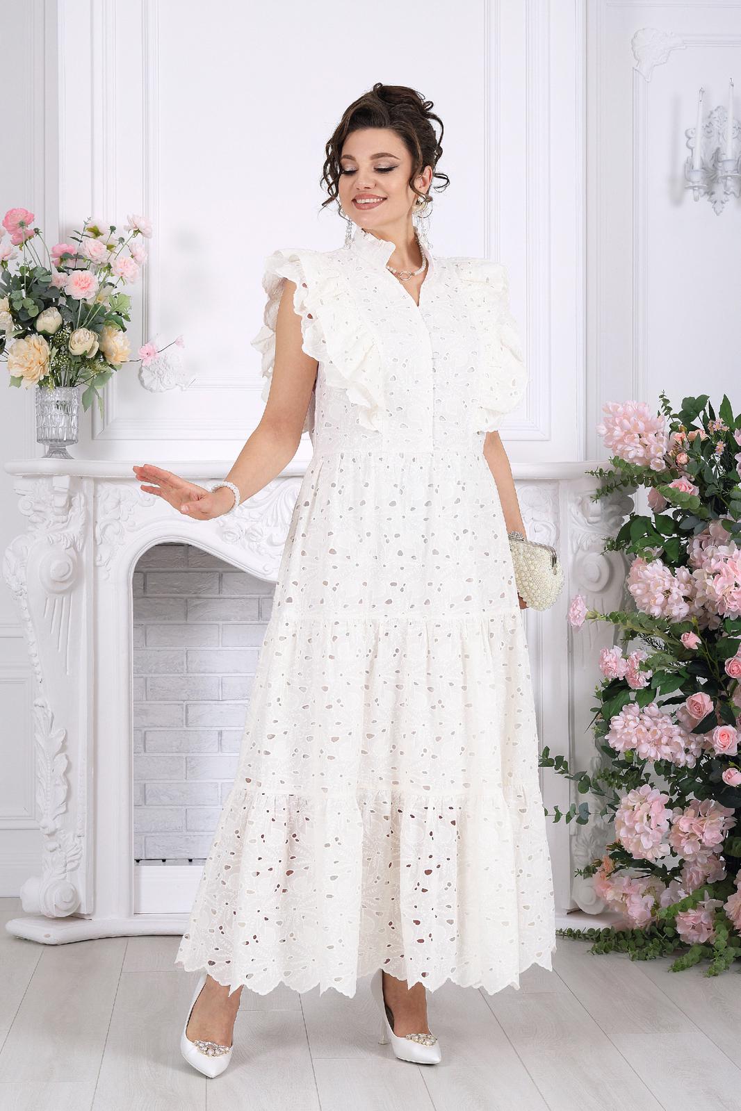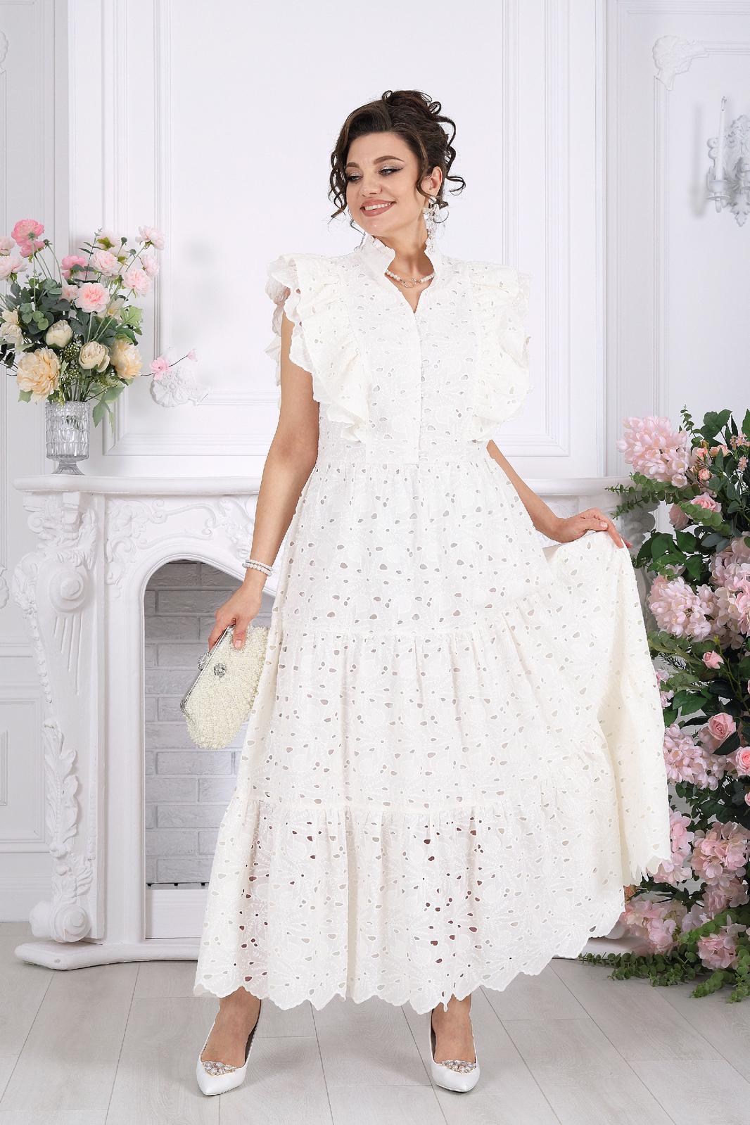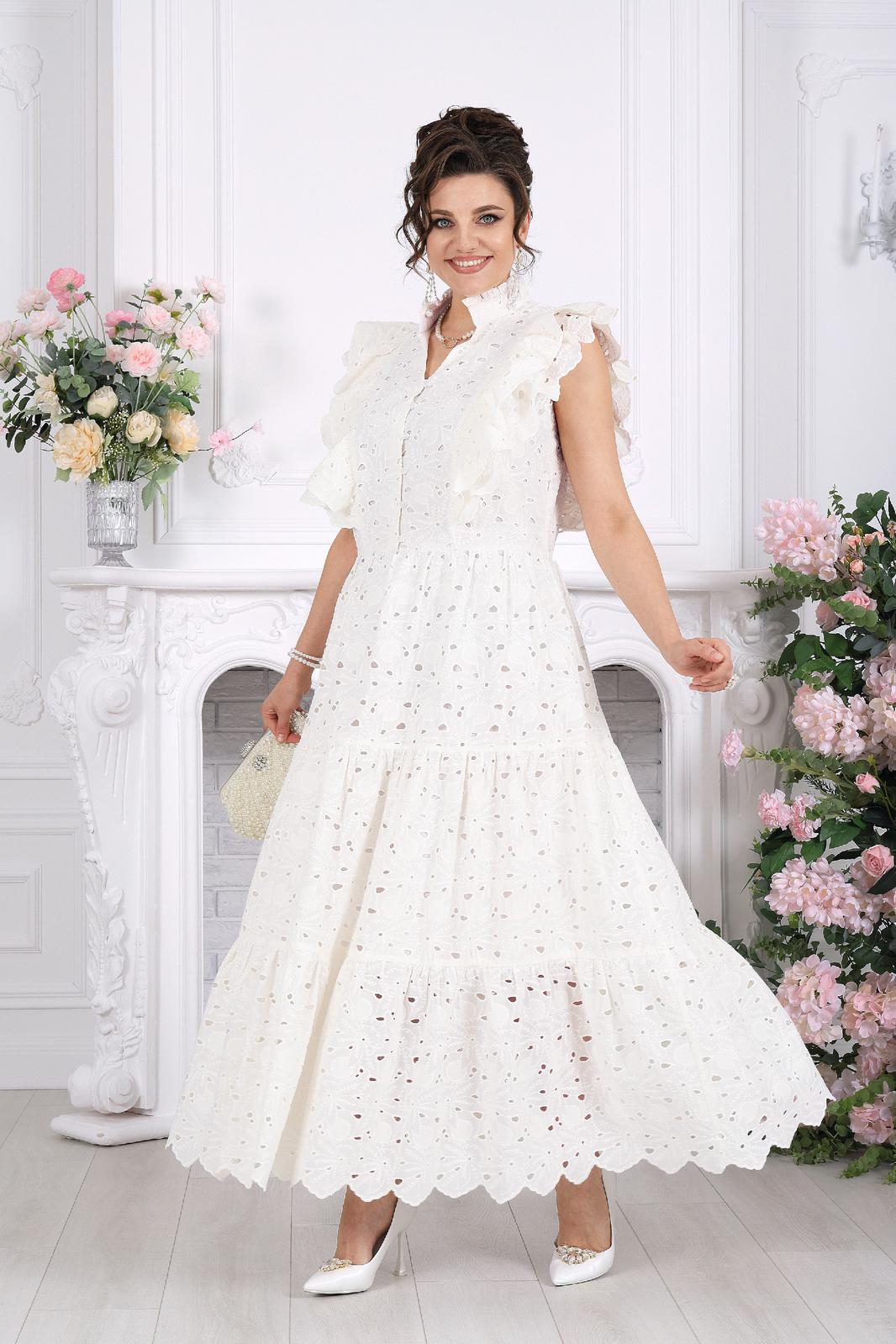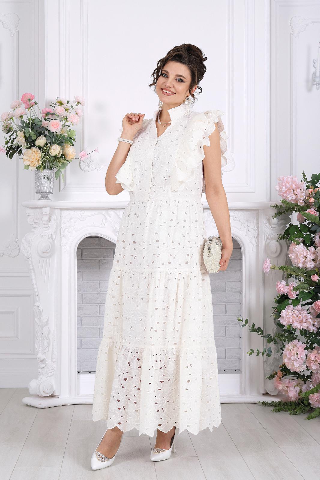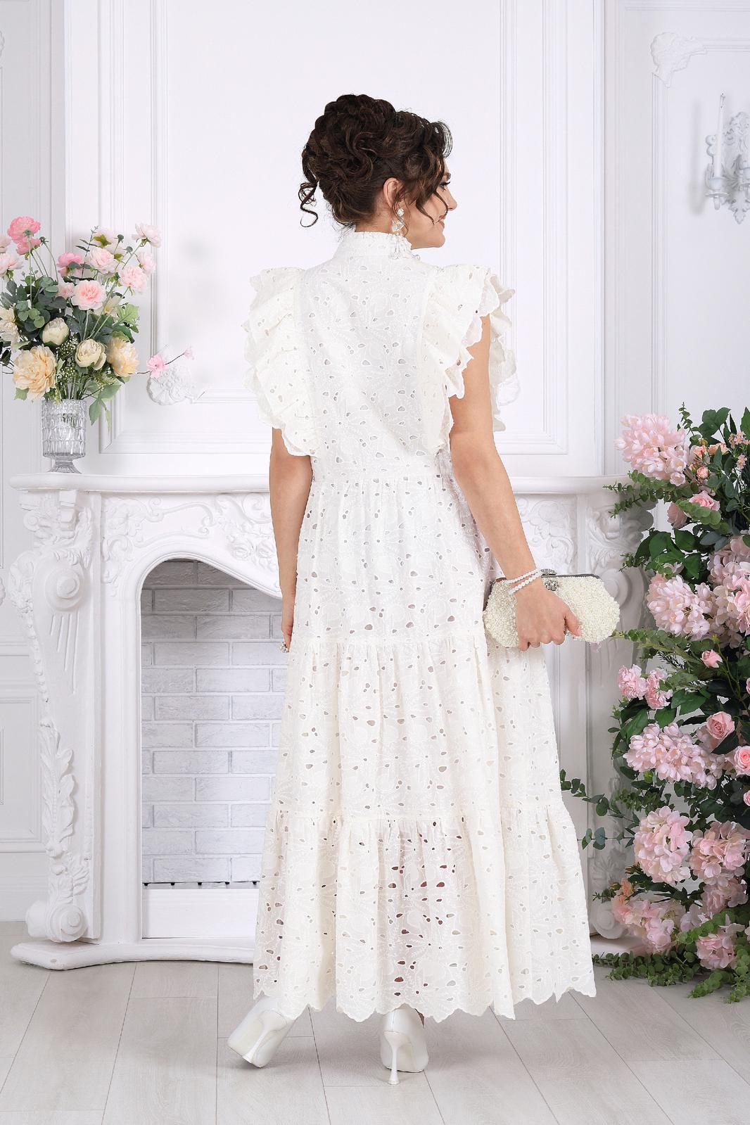 Это не просто платье — это готовый праздничный образ. Эффектное хлопковое «ришелье» с ажурным рисунком создаёт ощущение лёгкости и торжественности, словно вы уже на особом событии, где каждый взгляд прикован к вам.