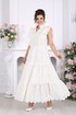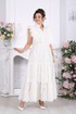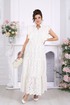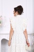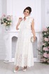 Платье женское из хлопка «ришелье», отрезное по линии талии, с лифом прилегающего силуэта и юбкой. Модель на х/б подкладке, без рукавов и плечевых накладок. Спинка и полочка с рельефными швами, направленными от пройм до талии, вставленными в них двумя воланами, присборенными по всей длине. Нижний волан широкий с фестоном по краю, верхний волан с обработанным краем. Горловина платья с V-образным вырезом по переду, оформлена воротником стойкой с присборенной рюшей по верхнему срезу воротника. По полочке оформлена центральная застёжка на 6 навесных петель и 6 пуговиц. В левом боковом шве застёжка на потайную тесьму-«молнию» (35 см). Юбка платья свободного кроя состоит из трёх присборенных воланов, по краю нижнего волана фестон. Длина платья по среднему шву спинки - см; длина платья по среднему шву спинки (от талии) – 139 см (50-58 р-р).