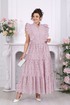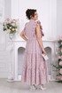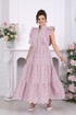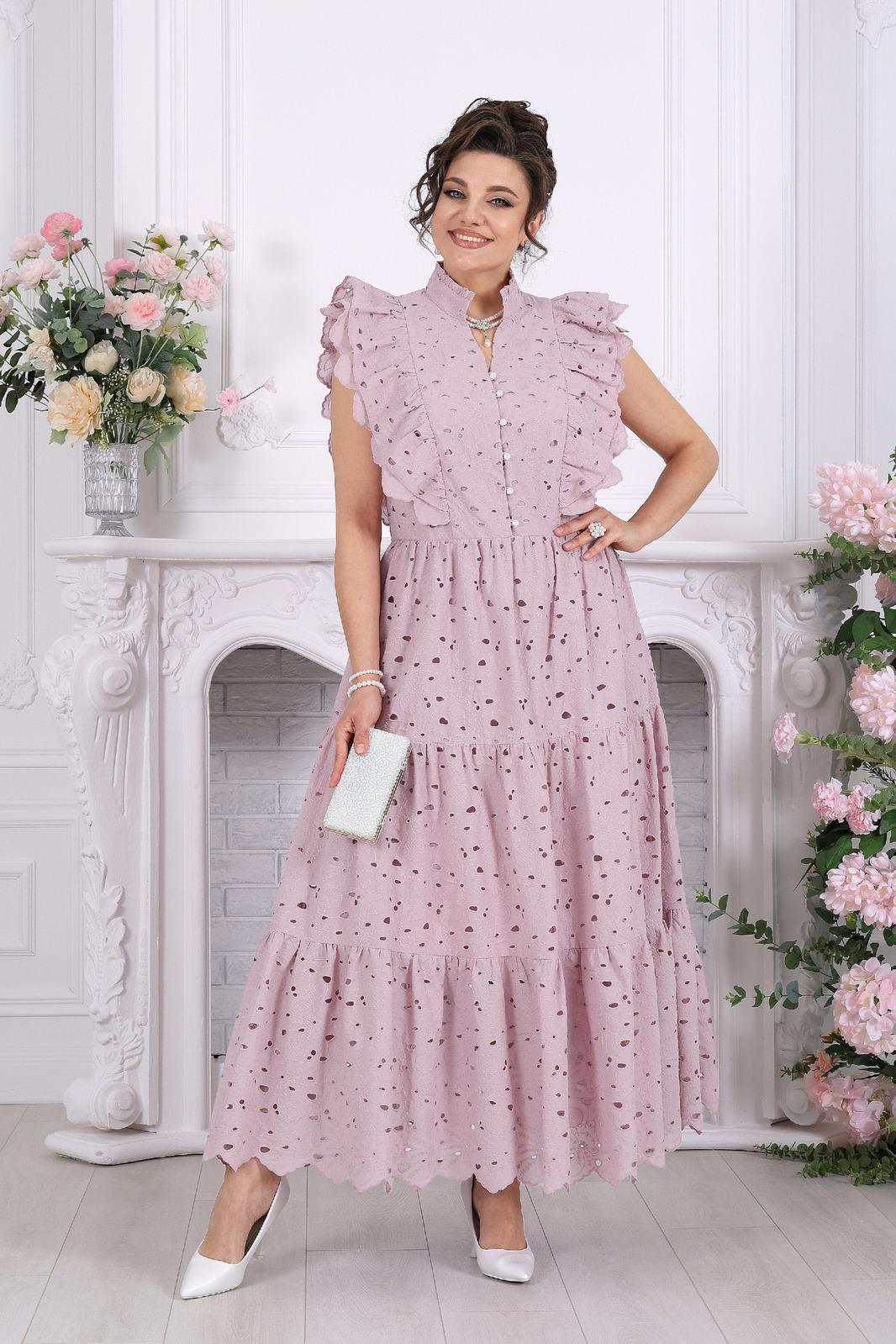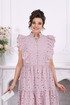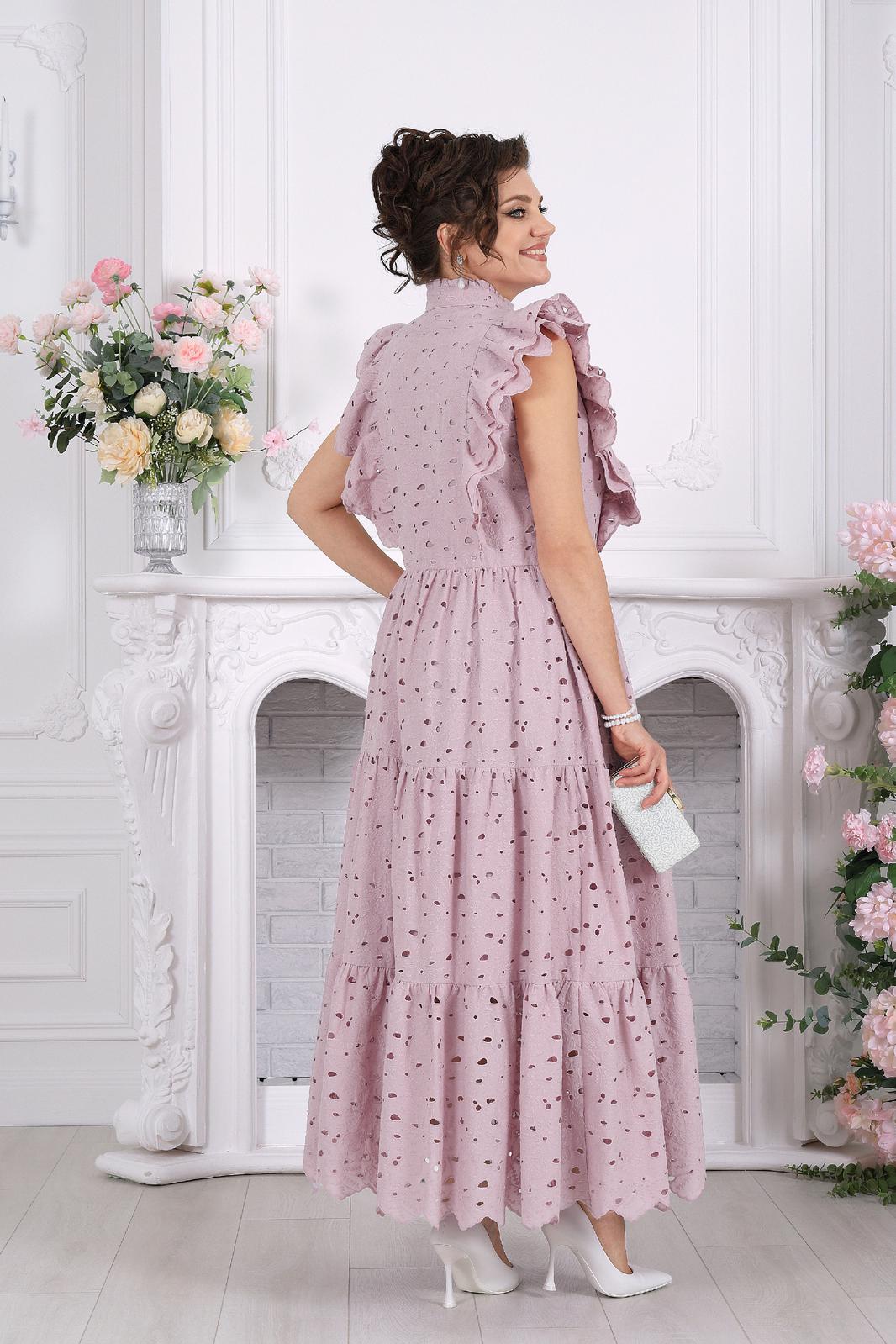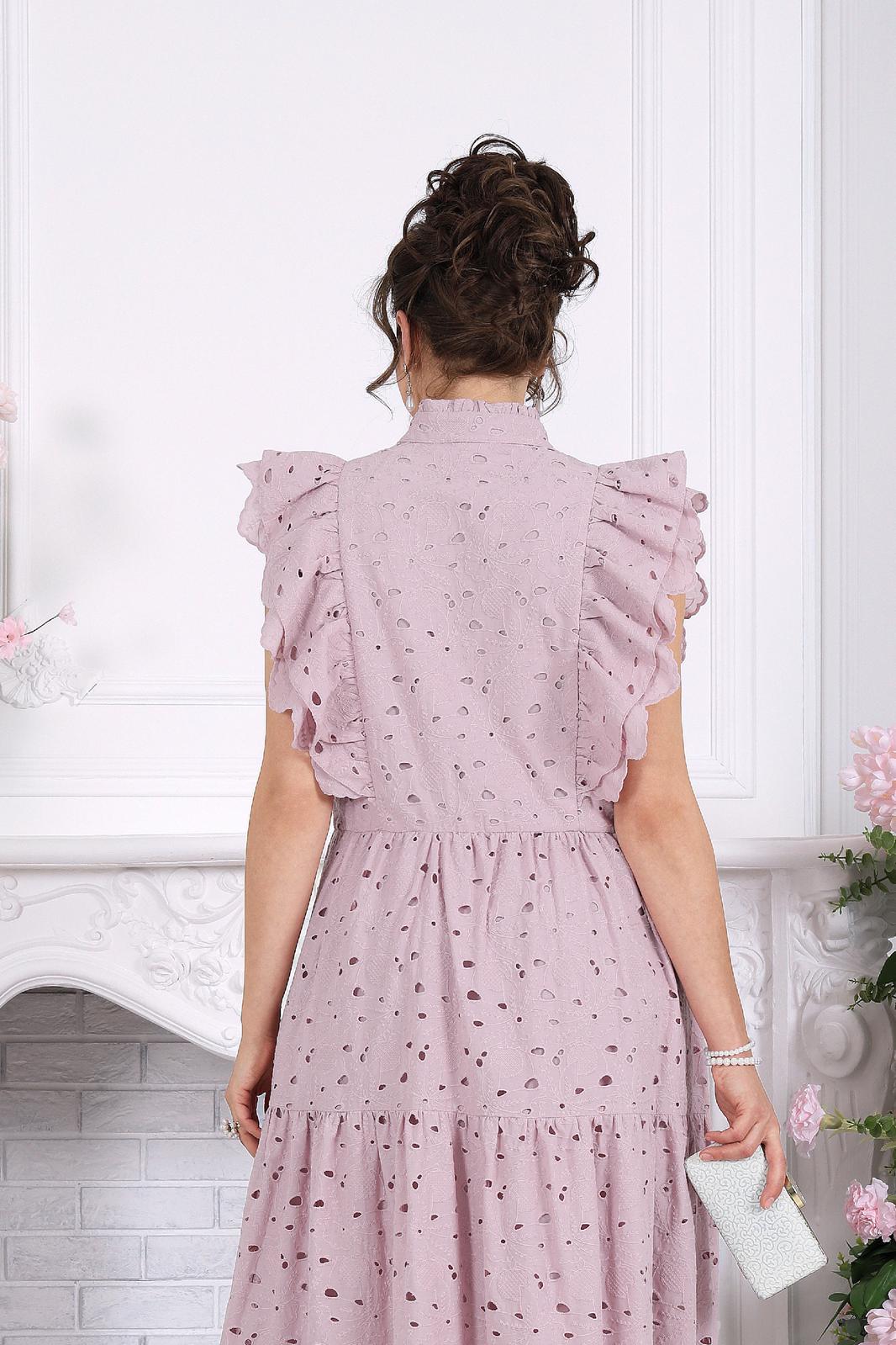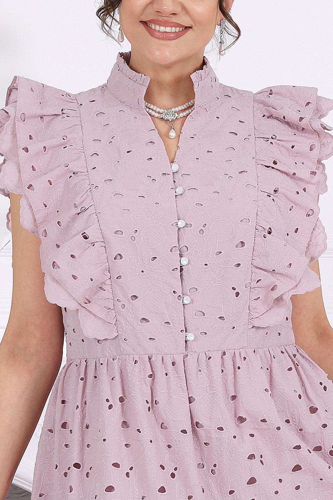 Платье женское из хлопка «ришелье», отрезное по линии талии, с лифом прилегающего силуэта и юбкой. Модель на х/б подкладке, без рукавов и плечевых накладок. Спинка и полочка с рельефными швами, направленными от пройм до талии, вставленными в них двумя воланами, присборенными по всей длине. Нижний волан широкий с фестоном по краю, верхний волан с обработанным краем. Горловина платья с V-образным вырезом по переду, оформлена воротником стойкой с присборенной рюшей по верхнему срезу воротника. По полочке оформлена центральная застёжка на 6 навесных петель и 6 пуговиц. В левом боковом шве застёжка на потайную тесьму-«молнию» (35 см). Юбка платья свободного кроя состоит из трёх присборенных воланов, по краю нижнего волана фестон. Длина платья по среднему шву спинки - см; длина платья по среднему шву спинки (от талии) – 139 см (50-58 р-р).