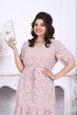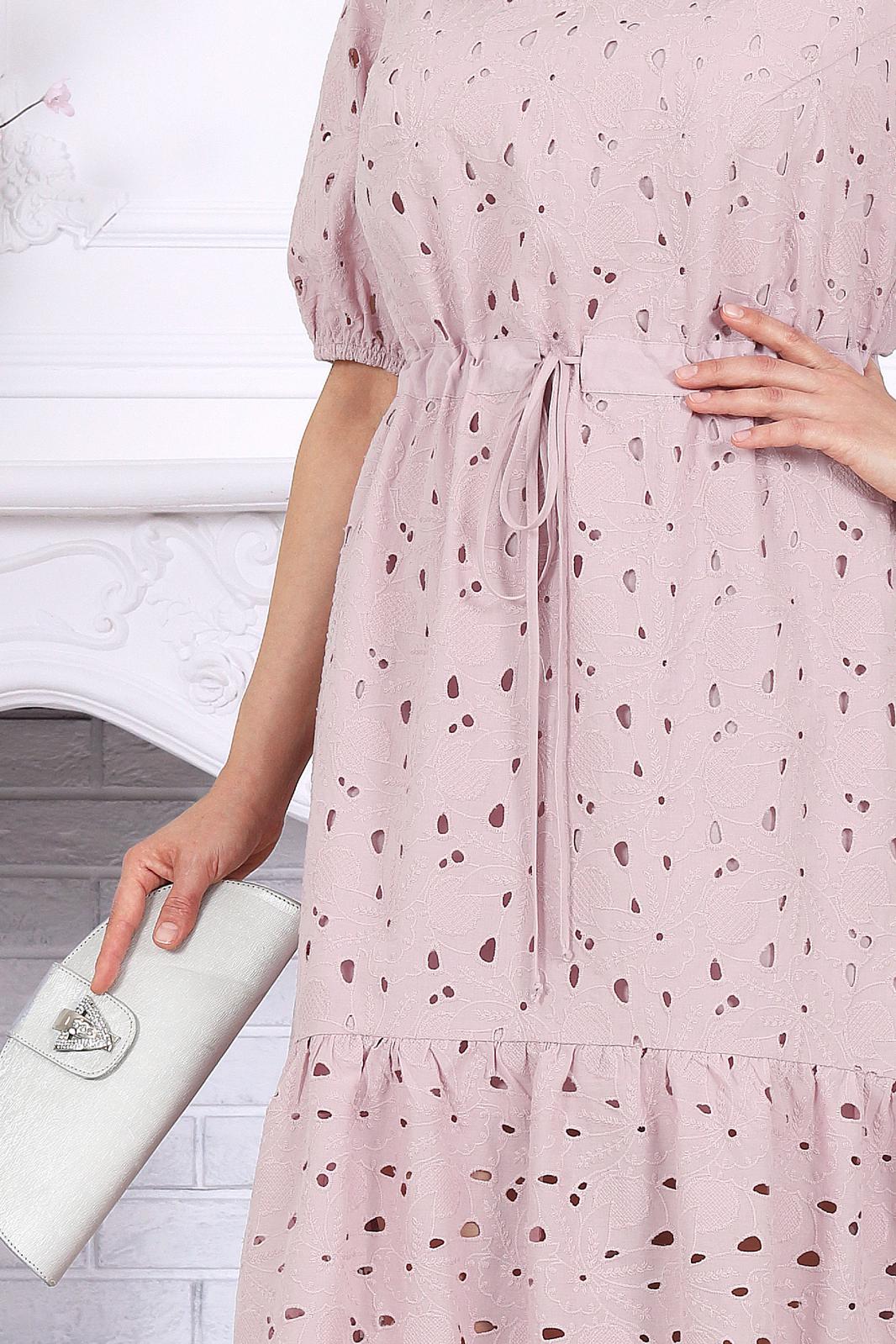 Платье женское, А - силуэта, выполнено из хлопкового ришелье. Модель на хлопковой подкладке, без плечевых накладок. Спереди оформлены нагрудные вытачки, направленные от пройм. По линии талии переда и спинки, настрочена кулиса из хлопчатобумажной ткани-компаньона, втянутой в неё шнура из этой же ткани. По низу платья пришит присборенный волан. Низ волана с фестоном. По спинке горловина округлой формы, по переду V-образная. Рукав короткий, втачной, по низу собран на резинку, шириной 1 см. Длина платья -129 см; длина рукава - 32 см.