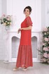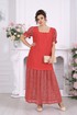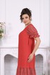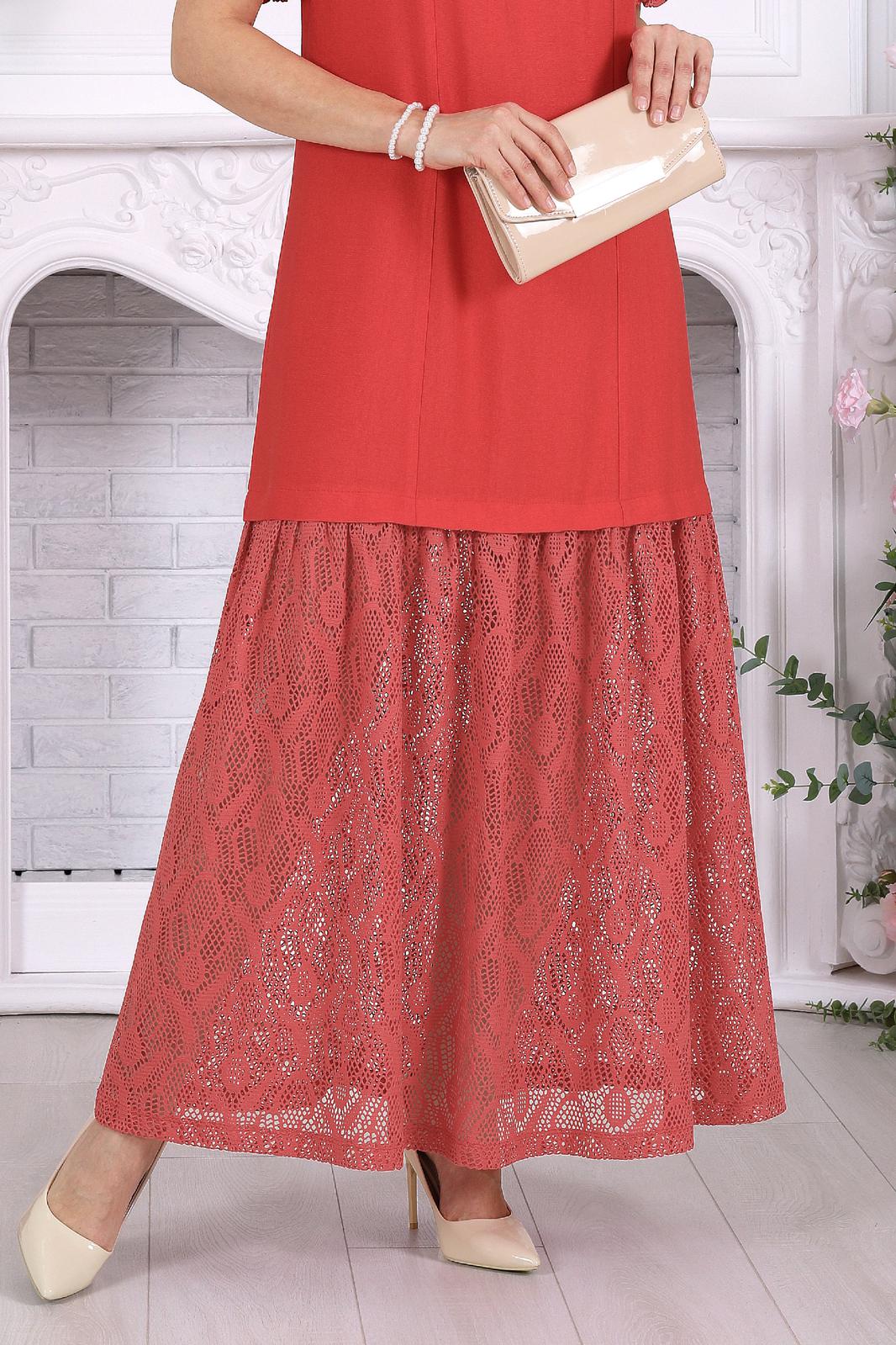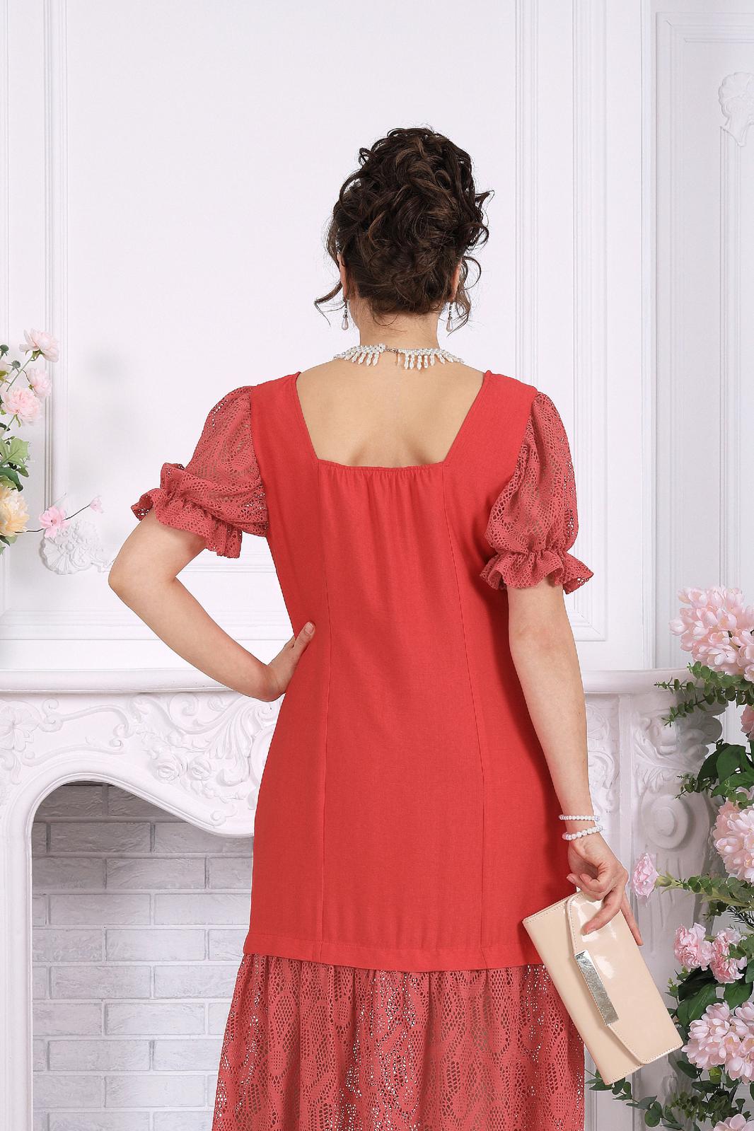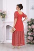 Платье женское, полуприлегающего силуэта. Модель с рельефными швами по переду и спинке, проходящими через центр груди, направленными вниз. По низу платья пришит волан из кружева, присборен по шву притачивания. Горловина по спинке и полочке прямоугольной формы, обработана обтачками. Для лучшего прилегания в горловину вставлена резинка, шириной 1 см. Застежка на потайную тесьму молнию расположена в левом боковом шве. Рукав втачной, короткий, на 5 см от низа настрочена резинка. Длина платья – 142 см (50-58 р-р.); длина рукава –23 см (50-58 р-р.).