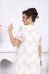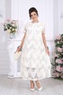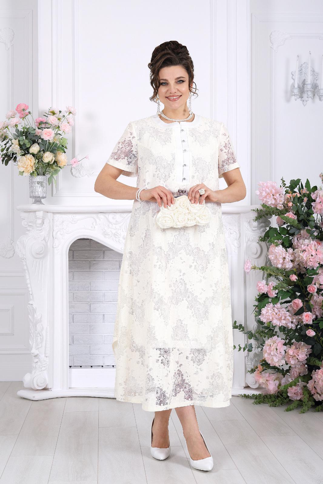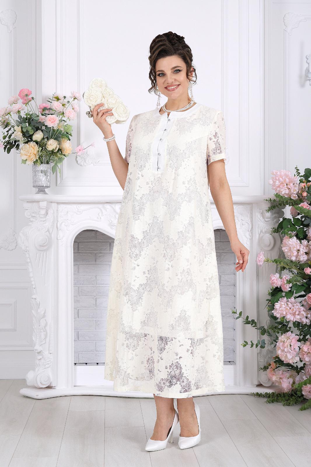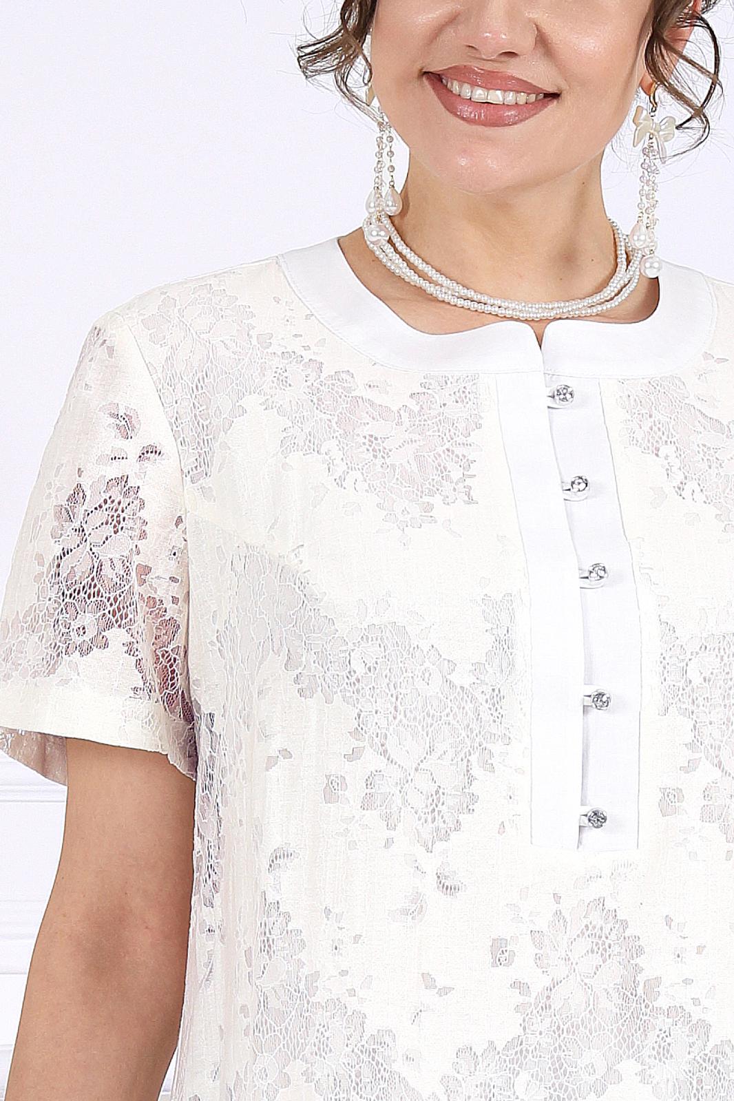 Платье женское А-силуэта, выполнено из гипюра х/б. Модель на х/б подкладке. По центру полочки оформлена застежка с притачными планками до линии груди. На планке обработана застёжка на 5 навесных петель и 5 пуговиц. Рукав в платье втачной короткий. Перед с нагрудными вытачками, направленными от пройм. Горловина оформлена воротником стойка. По боковым швам, внизу платья оформлены фигурные разрезы. Длина платья – см (50-54 р-р), см (56-66 р-р); длина рукава- см.