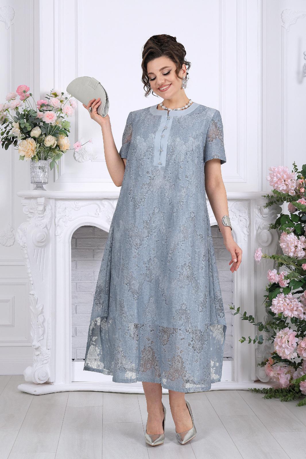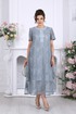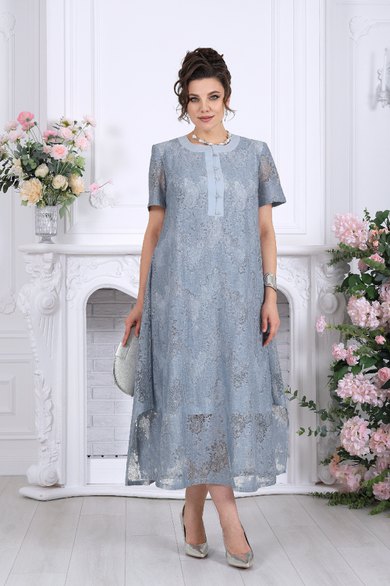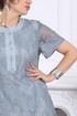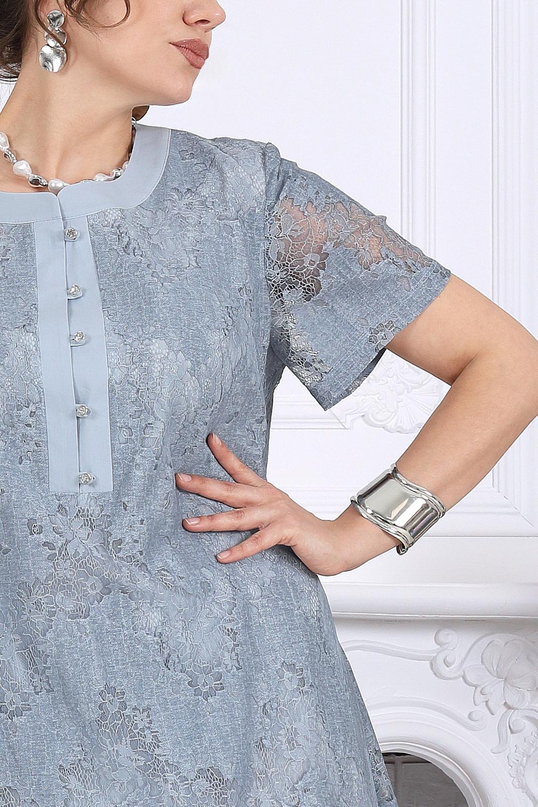 Платье женское А-силуэта, выполнено из гипюра х/б. Модель на х/б подкладке. По центру полочки оформлена застежка с притачными планками до линии груди. На планке обработана застёжка на 5 навесных петель и 5 пуговиц. Рукав в платье втачной короткий. Перед с нагрудными вытачками, направленными от пройм. Горловина оформлена воротником стойка. По боковым швам, внизу платья оформлены фигурные разрезы. Длина платья – см (50-54 р-р), см (56-66 р-р); длина рукава- см.