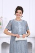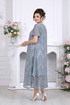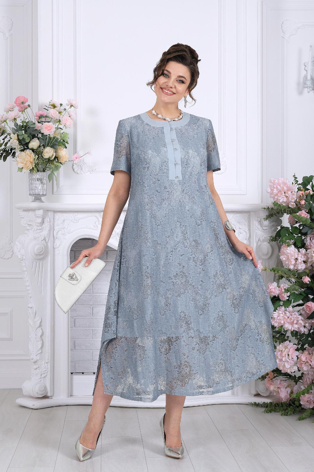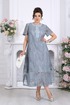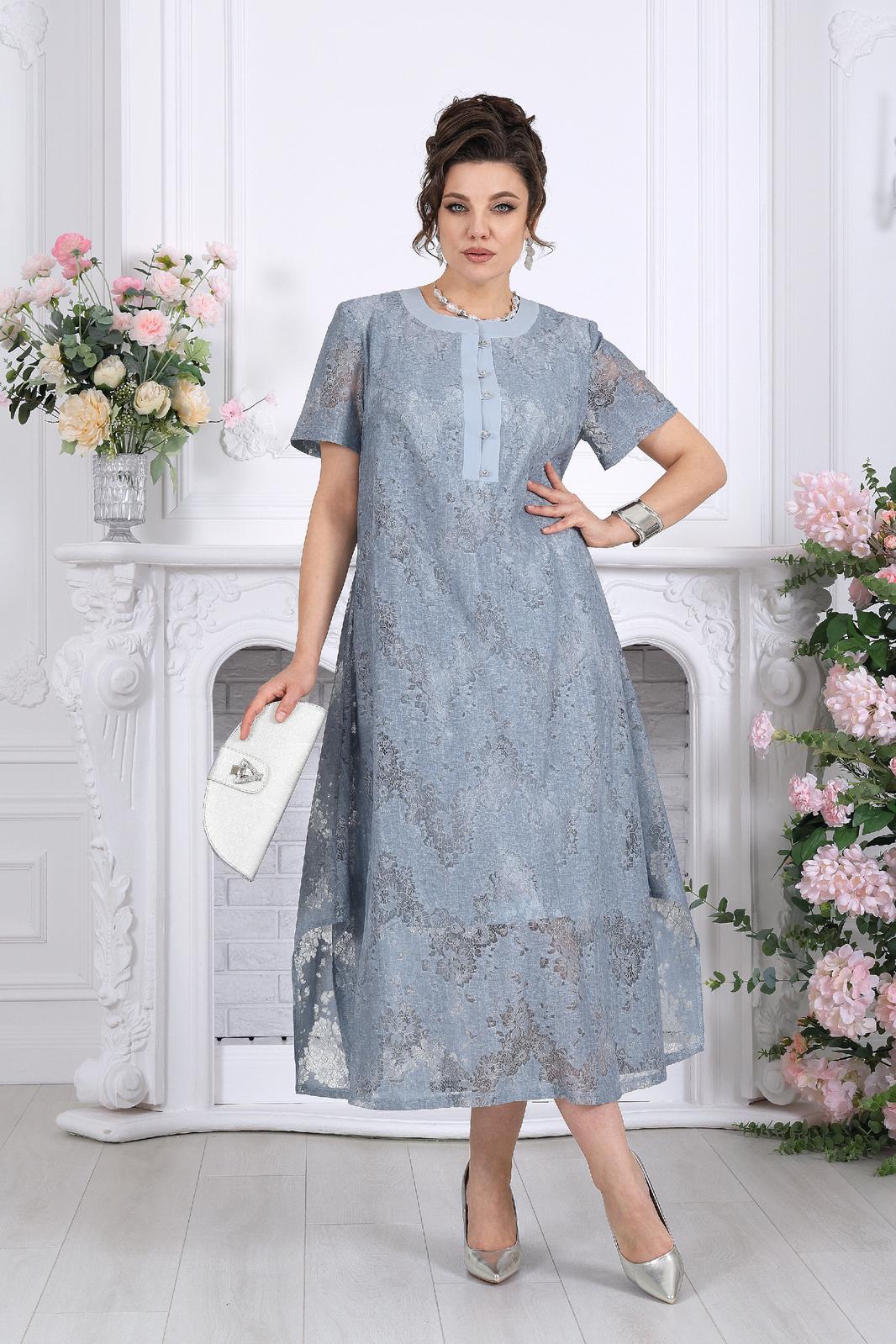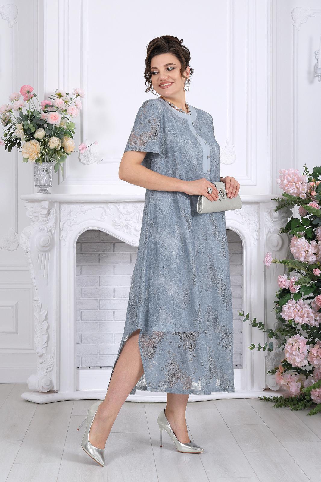 Платье женское А-силуэта, выполнено из гипюра х/б. Модель на х/б подкладке. По центру полочки оформлена застежка с притачными планками до линии груди. На планке обработана застёжка на 5 навесных петель и 5 пуговиц. Рукав в платье втачной короткий. Перед с нагрудными вытачками, направленными от пройм. Горловина оформлена воротником стойка. По боковым швам, внизу платья оформлены фигурные разрезы. Длина платья – см (50-54 р-р), см (56-66 р-р); длина рукава- см.