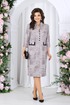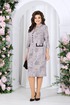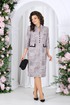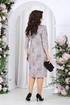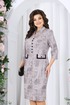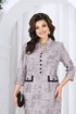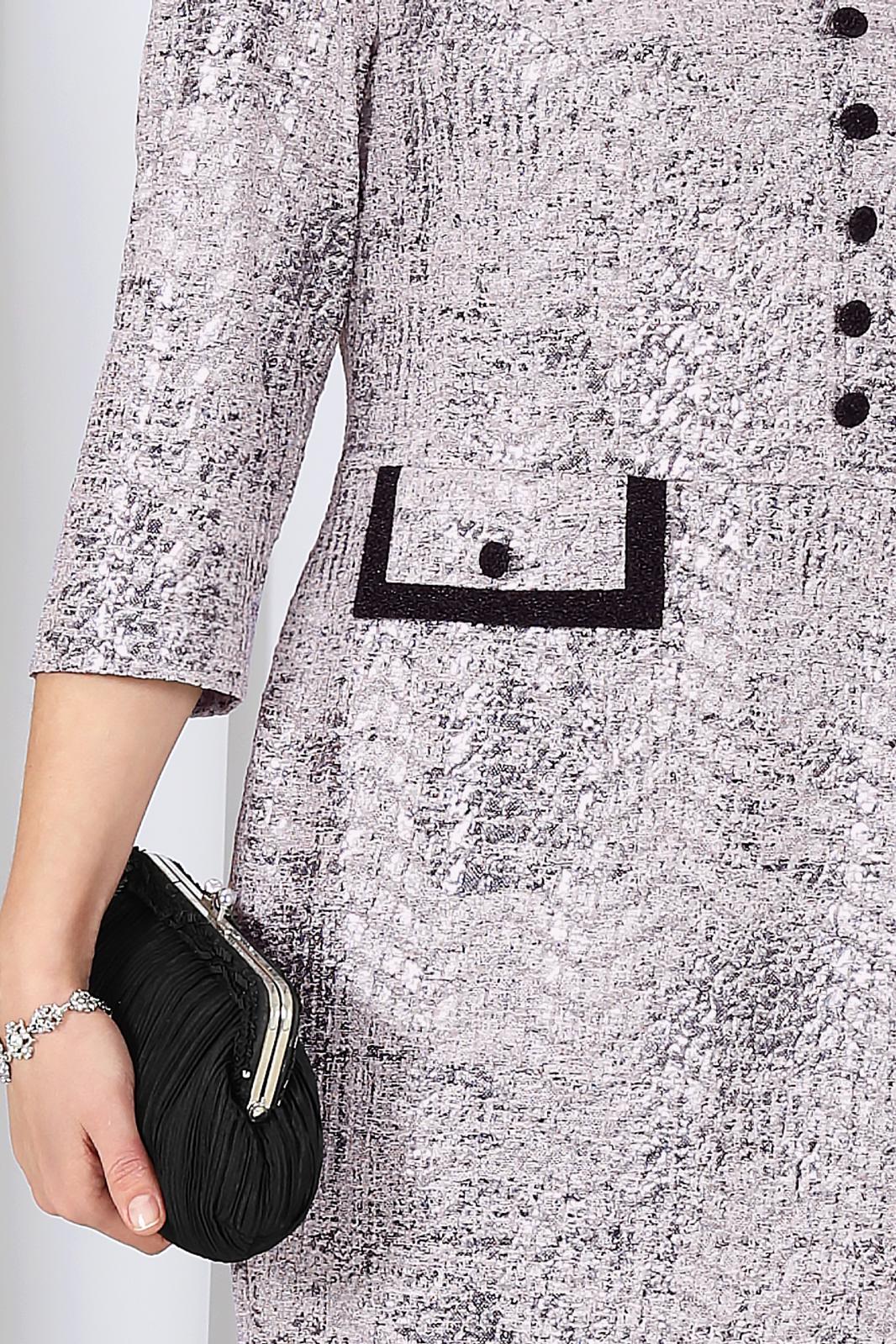 Платье женское, полуприлегающего силуэта, выполнено из жаккардового трикотажного полотна с напылением. Модель на трикотажной подкладке, с плечевыми накладками. Перед отрезной по линии талии: на верхней части обработаны рельефы, направленные от пройм, V-образный вырез и средний шов, декорированный пуговицами; на нижней части обработаны талиевые вытачки и настрочены клапаны с бейками по краю и пуговицами по центру. Спинка отрезная по линии талии; на верхней части обработаны рельефы, направленные от пройм, на нижней – талиевые вытачки и средний шов со шлицей. Горловина оформлена стойкой с закругленными концами. Застежка на потайную тесьму молнию расположена в среднем шве спинки и переходит на стойку. Рукав втачной, трехчетвертной. Бейки клапанов и обтяжные пуговицы выполнены из отделочного трикотажного полотна. Длина платья – 106 см; длина рукава – 45 см.