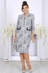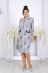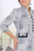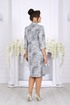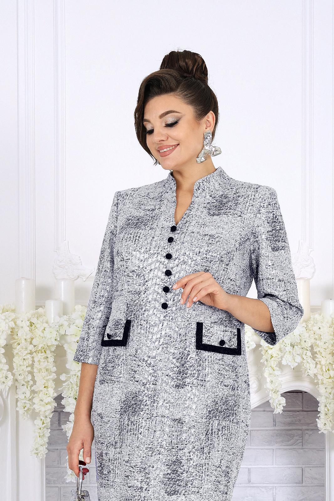 Платье женское, полуприлегающего силуэта, выполнено из жаккардового трикотажного полотна с напылением. Модель на трикотажной подкладке, с плечевыми накладками. Перед отрезной по линии талии: на верхней части обработаны рельефы, направленные от пройм, V-образный вырез и средний шов, декорированный пуговицами; на нижней части обработаны талиевые вытачки и настрочены клапаны с бейками по краю и пуговицами по центру. Спинка отрезная по линии талии; на верхней части обработаны рельефы, направленные от пройм, на нижней – талиевые вытачки и средний шов со шлицей. Горловина оформлена стойкой с закругленными концами. Застежка на потайную тесьму молнию расположена в среднем шве спинки и переходит на стойку. Рукав втачной, трехчетвертной. Бейки клапанов и обтяжные пуговицы выполнены из отделочного трикотажного полотна. Длина платья – 106 см; длина рукава – 45 см.