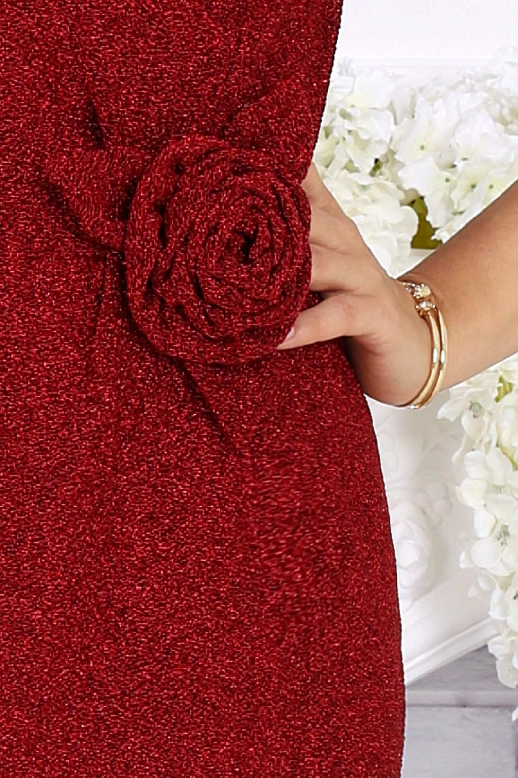 Платье выполнено из эффектного трикотажного полотна с фактурной лицевой стороной «люрекс», которое красиво переливается при свете и придаёт образу праздничное настроение. Трикотажная подкладка обеспечивает комфорт при носке и идеальную посадку.