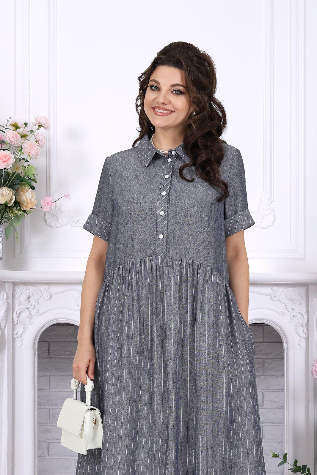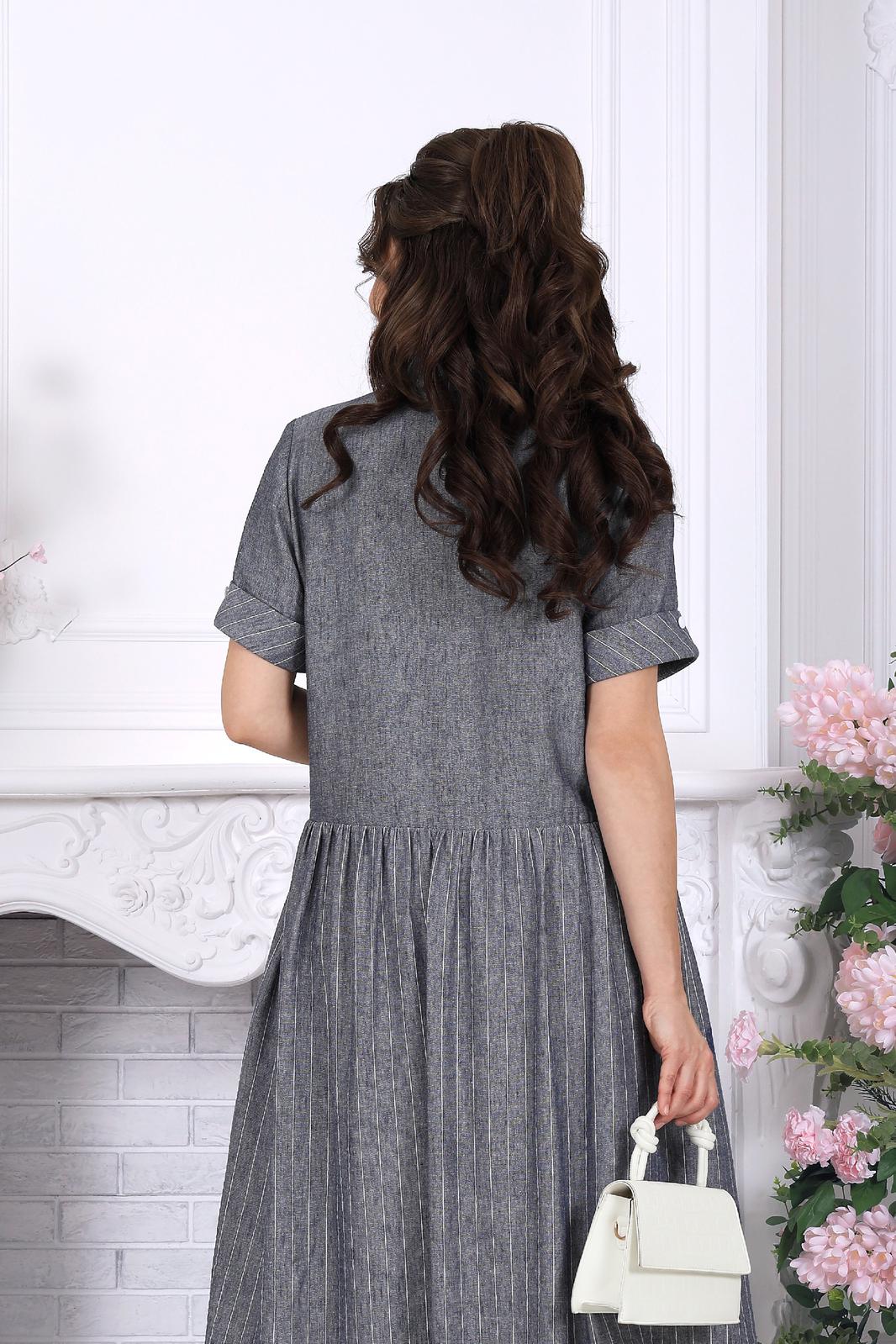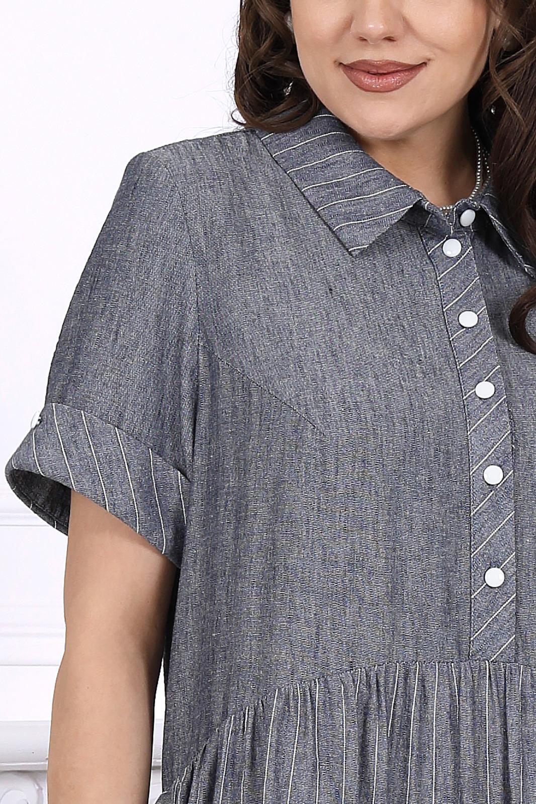 Платье женское прямого силуэта, отрезное по линии талии. Лиф платья и рукава из ткани однотон, по структуре, напоминающей лён. Воротник, стойка, планки, манжеты рукава и низ платья из ткани компаньон в полоску, по структуре, напоминающей лён. Линия талии фигурная и со сборкой по верхнему срезу юбки. По центру полочки оформлена застежка с притачными планками до линии талии на 6 петель и 6 пуговиц. Рукав в платье втачной короткий, низ обработан притачной манжетой с «отворотом» и манжета декорирована пуговицей. Перед с нагрудными вытачками, направленными от пройм. Горловина оформлена отложным воротником со стойкой. В боковых швах платья, обработаны карманы. Низ платья на х/б подкладке. Длина платья –114 см (50-58 р-р); длина рукава-23,5 см.