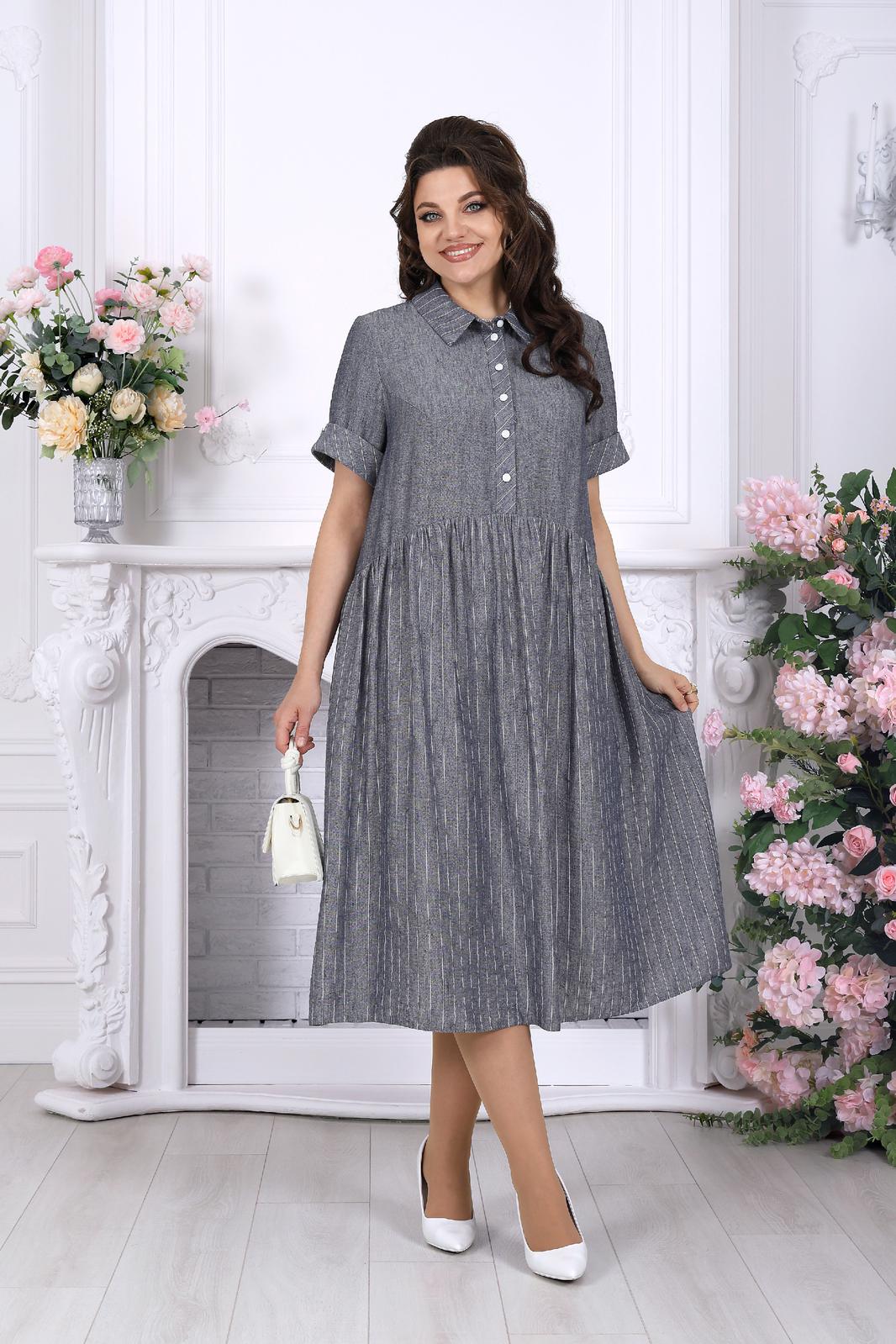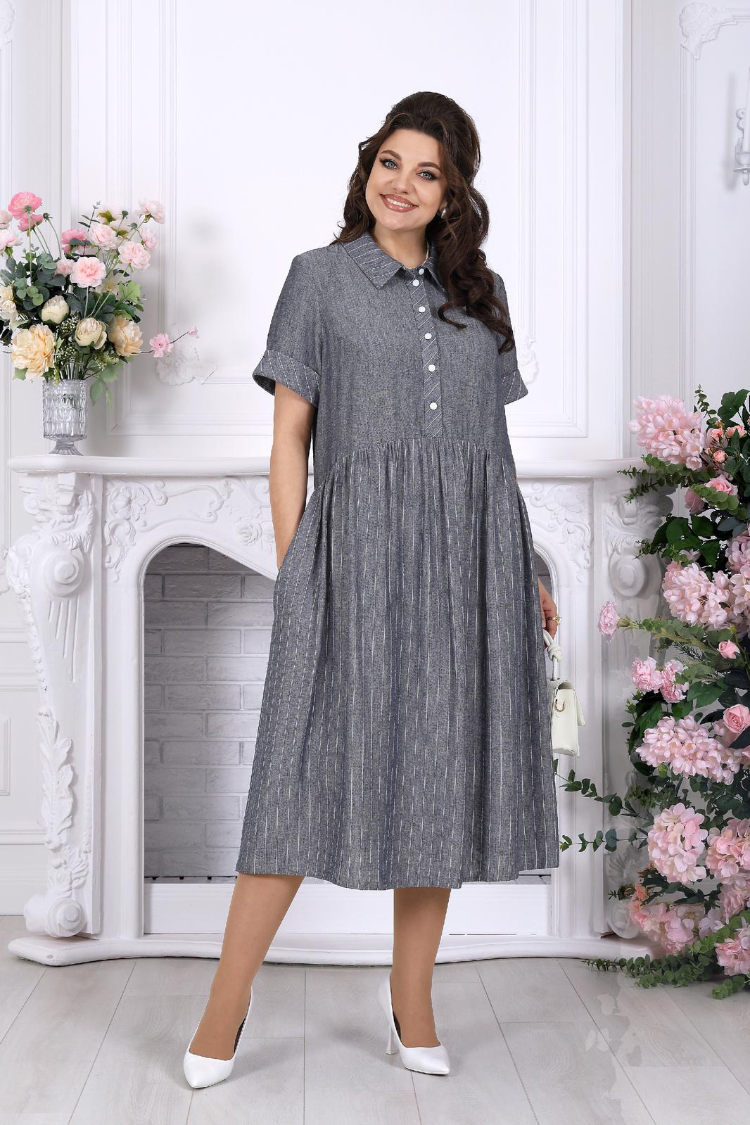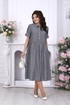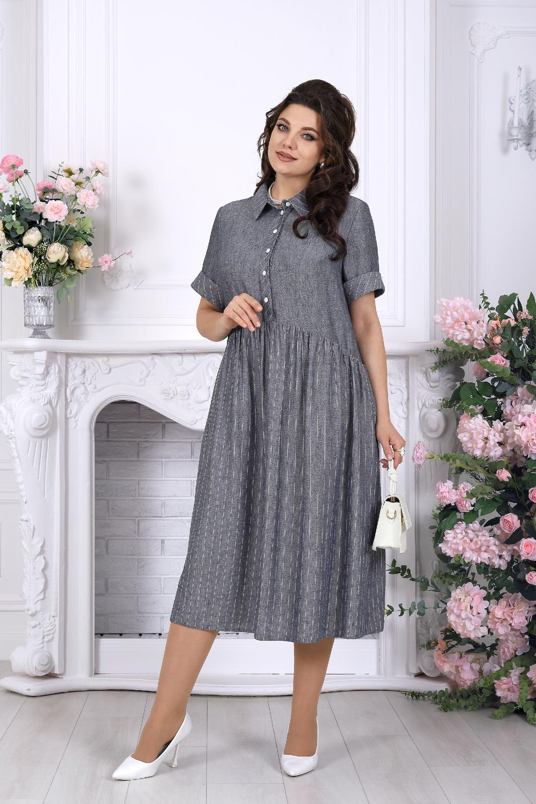 Платье женское прямого силуэта, отрезное по линии талии. Лиф платья и рукава из ткани однотон, по структуре, напоминающей лён. Воротник, стойка, планки, манжеты рукава и низ платья из ткани компаньон в полоску, по структуре, напоминающей лён. Линия талии фигурная и со сборкой по верхнему срезу юбки. По центру полочки оформлена застежка с притачными планками до линии талии на 6 петель и 6 пуговиц. Рукав в платье втачной короткий, низ обработан притачной манжетой с «отворотом» и манжета декорирована пуговицей. Перед с нагрудными вытачками, направленными от пройм. Горловина оформлена отложным воротником со стойкой. В боковых швах платья, обработаны карманы. Низ платья на х/б подкладке. Длина платья –114 см (50-58 р-р); длина рукава-23,5 см.