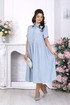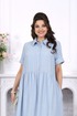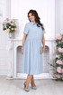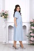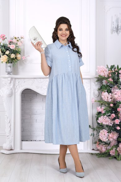 Платье женское прямого силуэта, отрезное по линии талии. Лиф платья и рукава из ткани однотон, по структуре, напоминающей лён. Воротник, стойка, планки, манжеты рукава и низ платья из ткани компаньон в полоску, по структуре, напоминающей лён. Линия талии фигурная и со сборкой по верхнему срезу юбки. По центру полочки оформлена застежка с притачными планками до линии талии на 6 петель и 6 пуговиц. Рукав в платье втачной короткий, низ обработан притачной манжетой с «отворотом» и манжета декорирована пуговицей. Перед с нагрудными вытачками, направленными от пройм. Горловина оформлена отложным воротником со стойкой. В боковых швах платья, обработаны карманы. Низ платья на х/б подкладке. Длина платья –114 см (50-58 р-р); длина рукава-23,5 см.