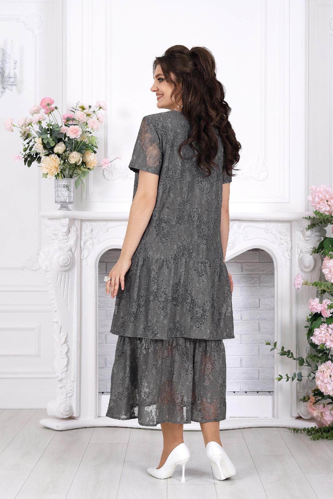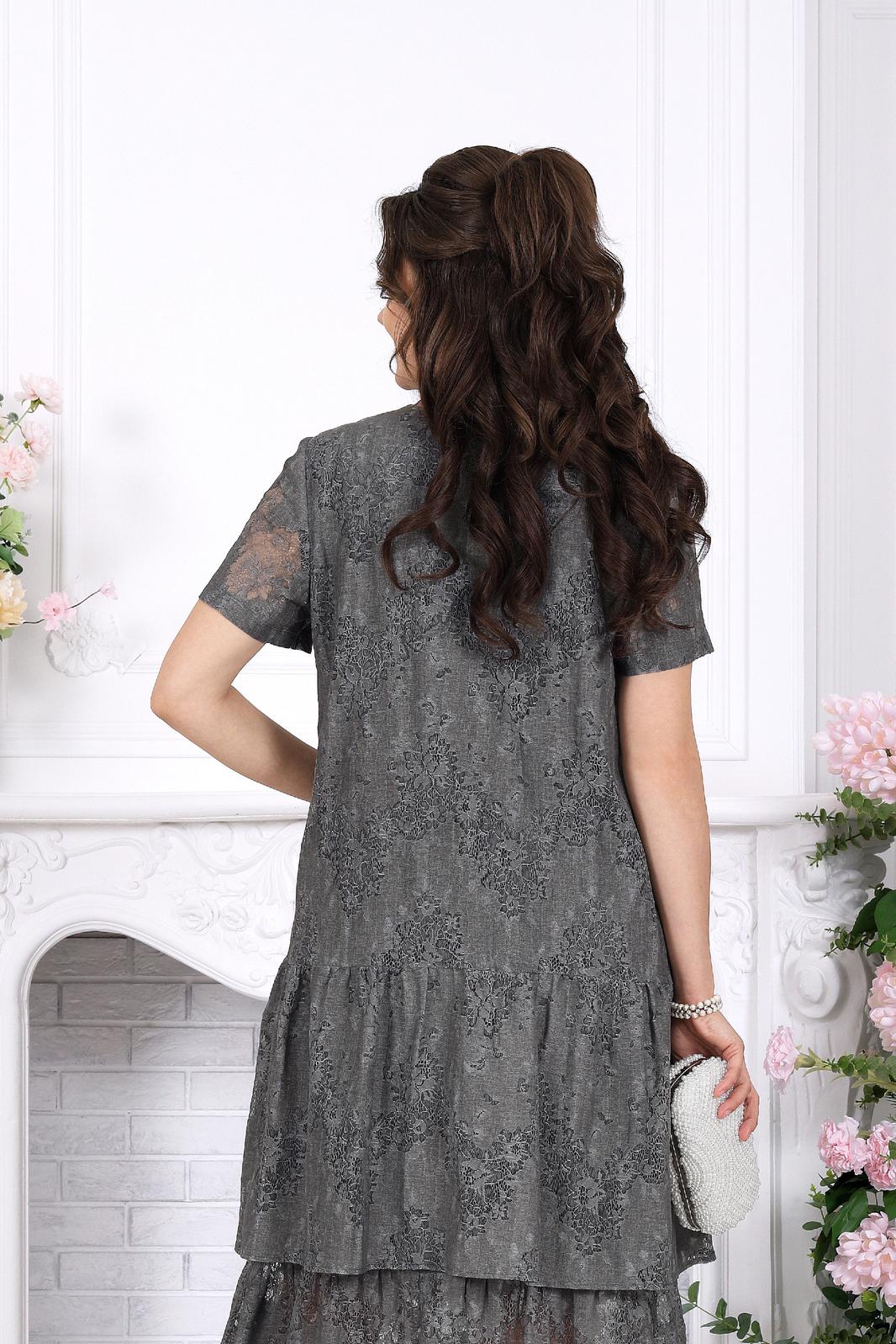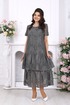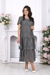 Платье женское, свободного кроя А силуэта, выполнено из хлопкового гипюра. Модель на хлопчатобумажной подкладке, с коротким рукавом, без плечевых накладок. По переду обработаны вытачки, направленные от пройм. Платье отрезное по линии бёдер с притачным, присборенным воланом. Второй волан присборен и пришит к низу подкладки. Вырез горловины спинки округлый, по переду – углубленный округлый. Длина платья –125 см; длина рукава-22 см.