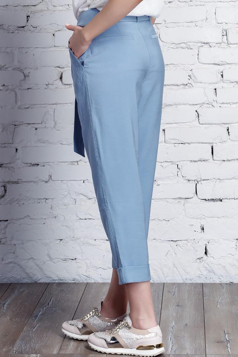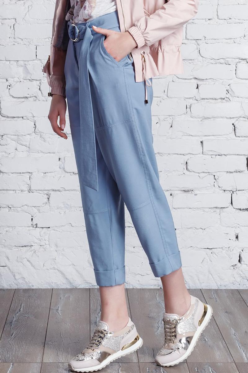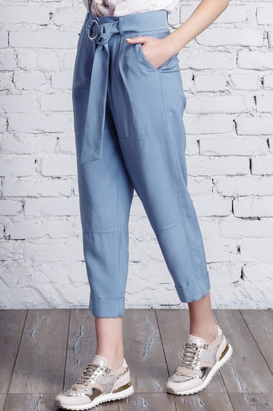 Брюки из модала с высокой посадкой и съемным поясом, завязывающимся через кольца на талии. Спереди боковые наклонные карманы и складки. На передних половинках брюк горизонтальные подрезы, все швы закреплены двойной строчкой. По низу брюк манжеты.