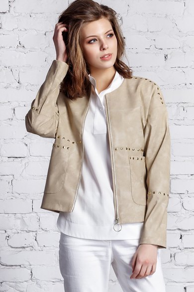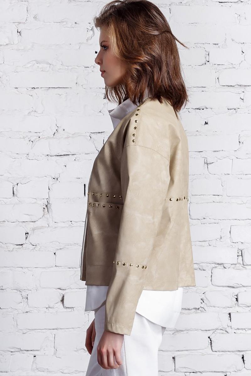 Стильная куртка из экокожи прямого силуэта со спущенным рукавом с застежкой на золотую металлическую молнию. По плечевым швам, по декоративным подрезам переда, спинки и рукава, верхнему срезу накладных карманов установлены металлические хольнитены золотистого цвета, служащие декором.