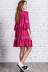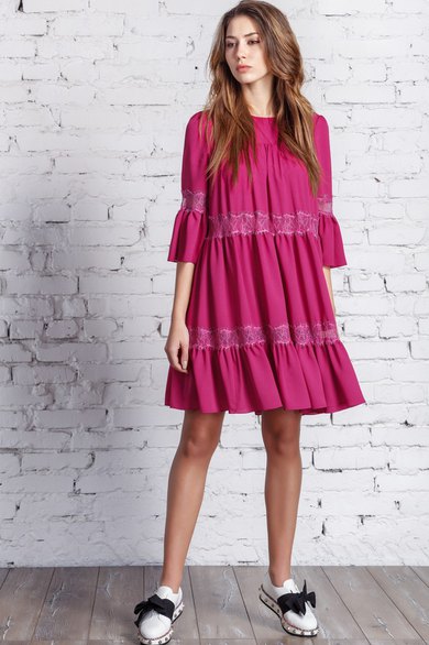 Стильное платье расширенного силуэта из тонкой креповой ткани яркого цвета с горизонтальными подрезами и кружевом. Рукава втачные с притачным воланом по низу длиной ниже локтя.