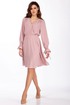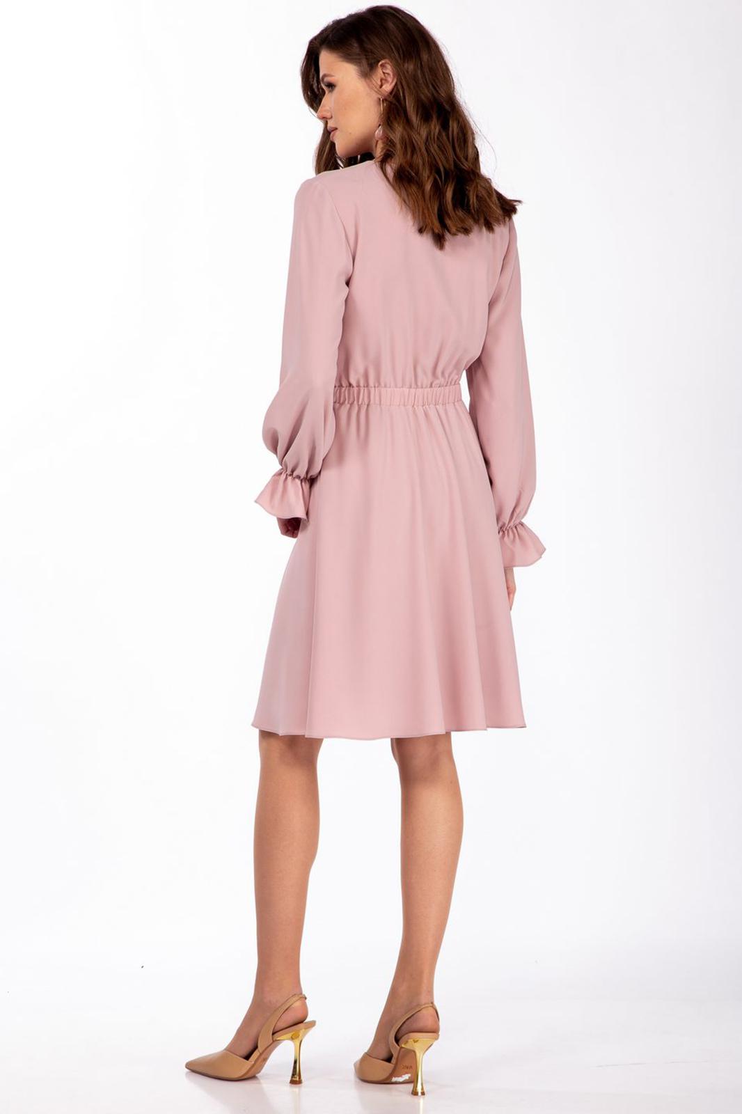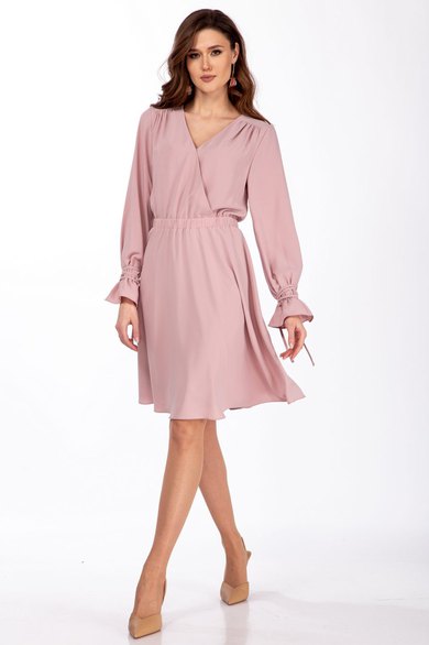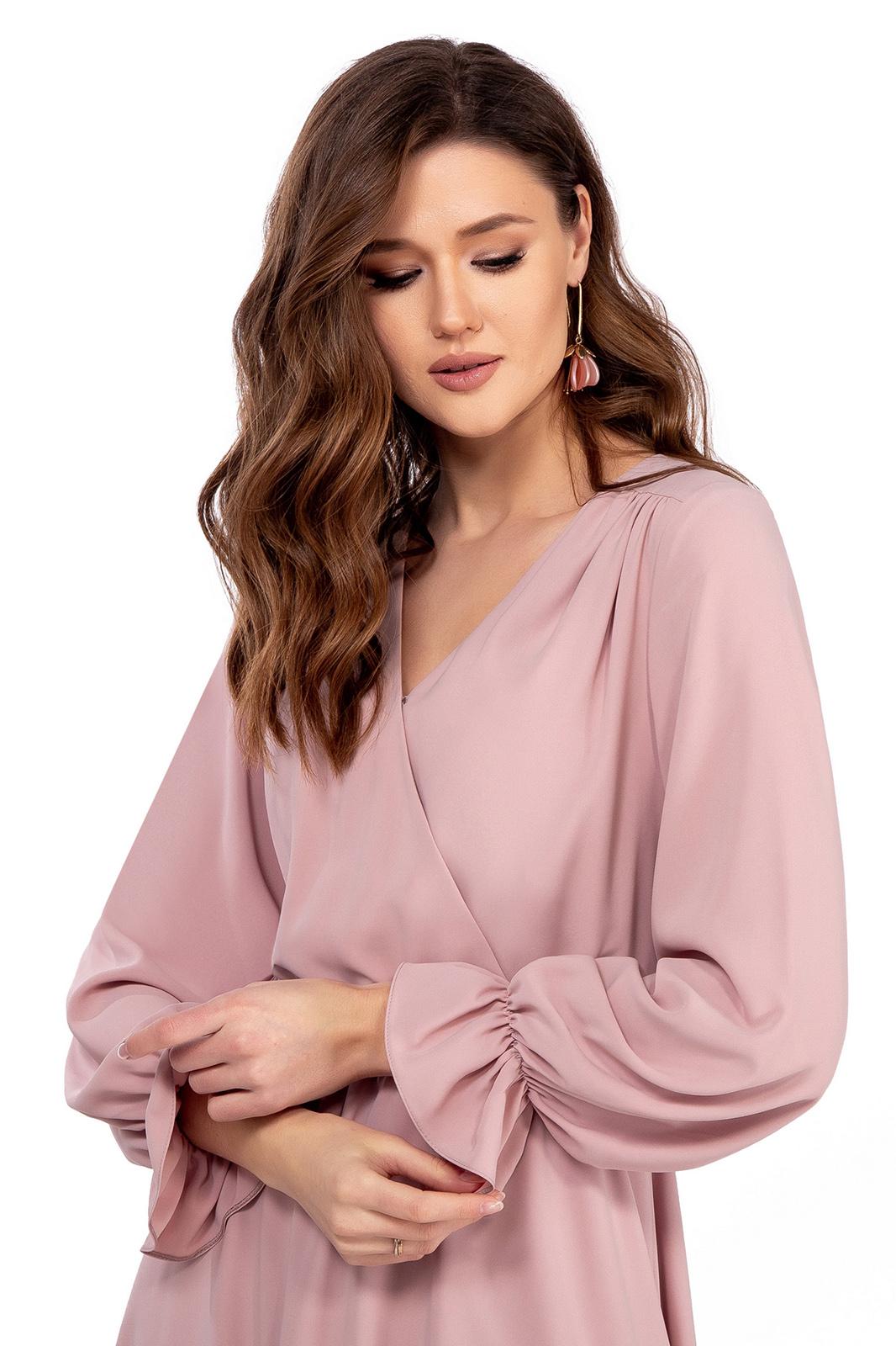 Платье женское из шифона на подкладке, полуприлегающего силуэта. Лиф переда платья с «запахом», с застежкой на 1 потайную кнопку. Детали с кокетками, в швах обработана сборка. Юбка платья расширенного силуэта, на подкладке. Между лифом и юбкой платья – втачной пояс, в который вставлена эластичная тесьма. Рукава втачные одношовные, по низу рукавов настрочена эластичная тесьма, в шов вставлены по 2 навесные петли и через которые протянут шнур. Вырез горловины «V-образной» формы.