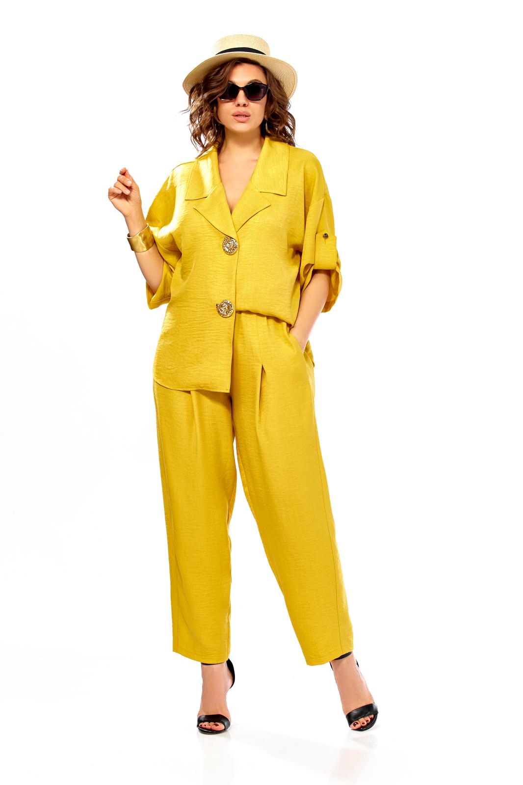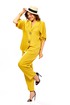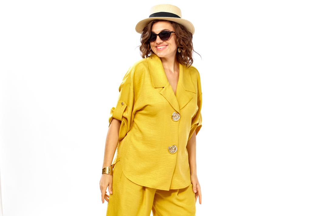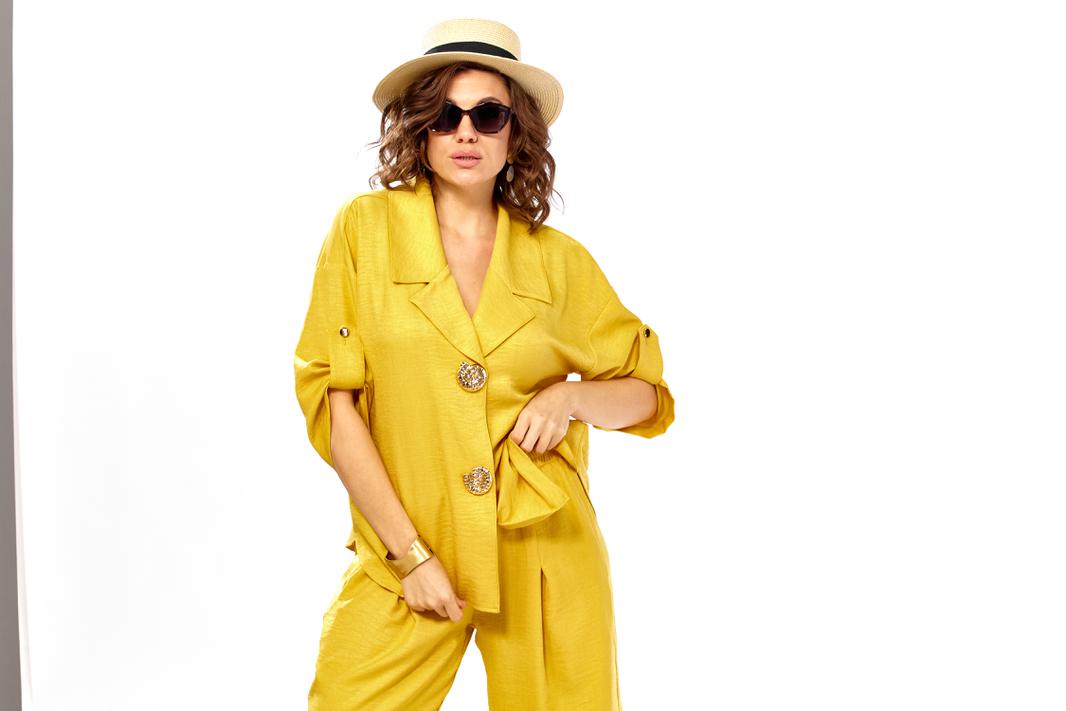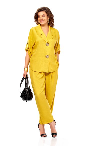 Шикарный костюм свободного силуэта. Застежка на две декоративные металлические кнопки. Воротник пиджачного типа. Рукав спущенный с патой, застегивающейся на пуговицу. Низ фигурной формы. Брюки свободные, зауженные к низу, с вертикальной вставкой вдоль бокового шва. По переду заложены односторонние складки. По спинке отрезная кокетка. Карманы в боковых швах. Верхний срез обработан притачным поясом.