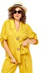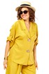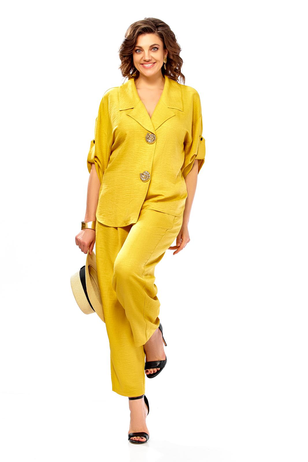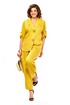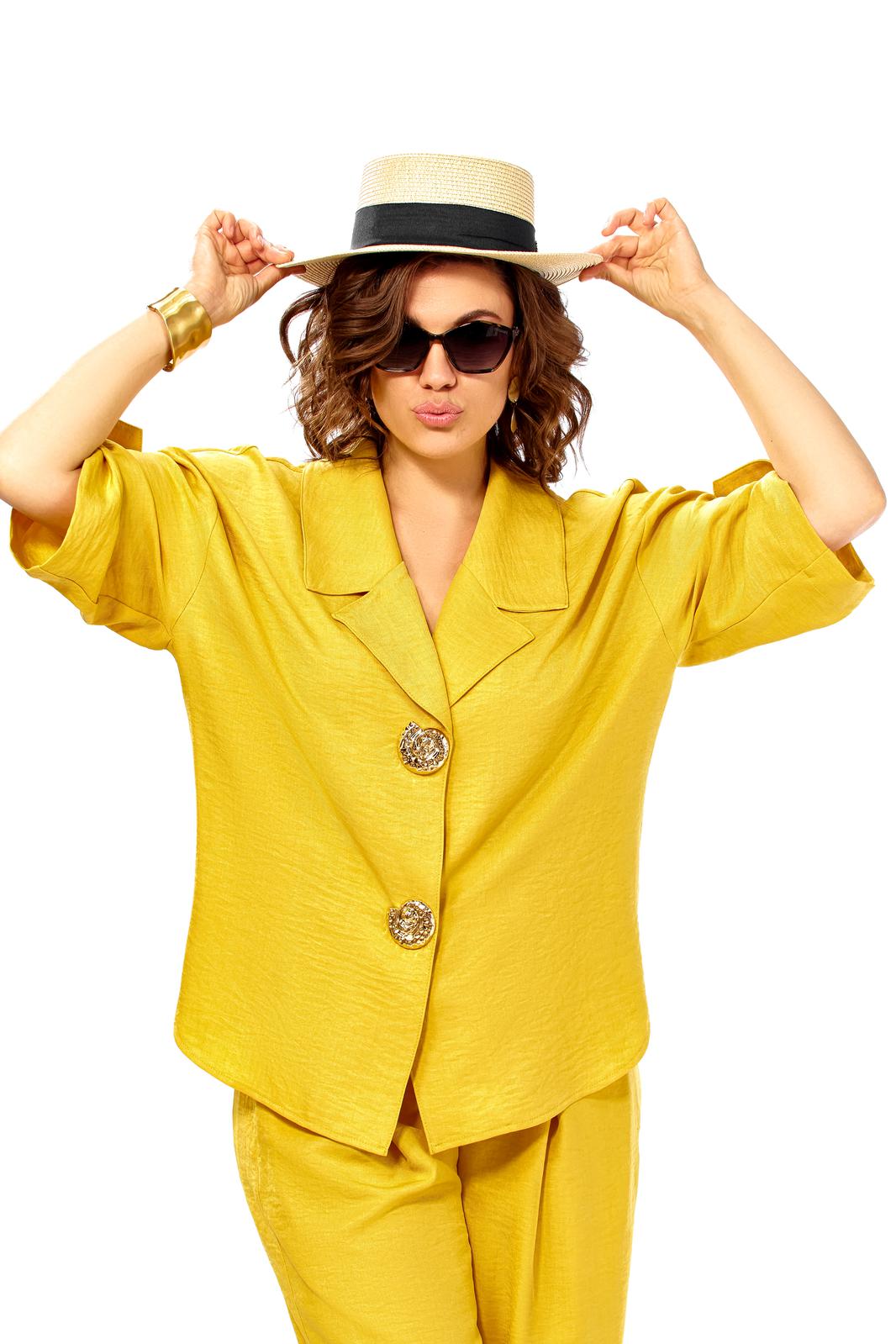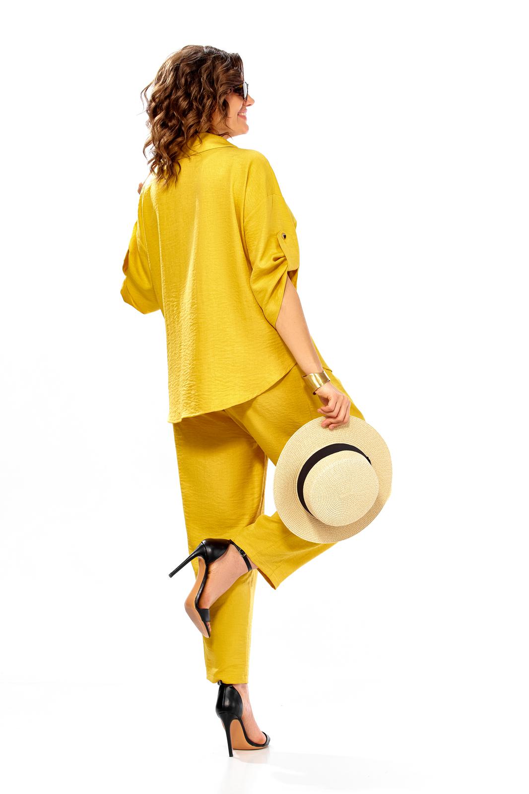 Шикарный костюм свободного силуэта. Застежка на две декоративные металлические кнопки. Воротник пиджачного типа. Рукав спущенный с патой, застегивающейся на пуговицу. Низ фигурной формы. Брюки свободные, зауженные к низу, с вертикальной вставкой вдоль бокового шва. По переду заложены односторонние складки. По спинке отрезная кокетка. Карманы в боковых швах. Верхний срез обработан притачным поясом.